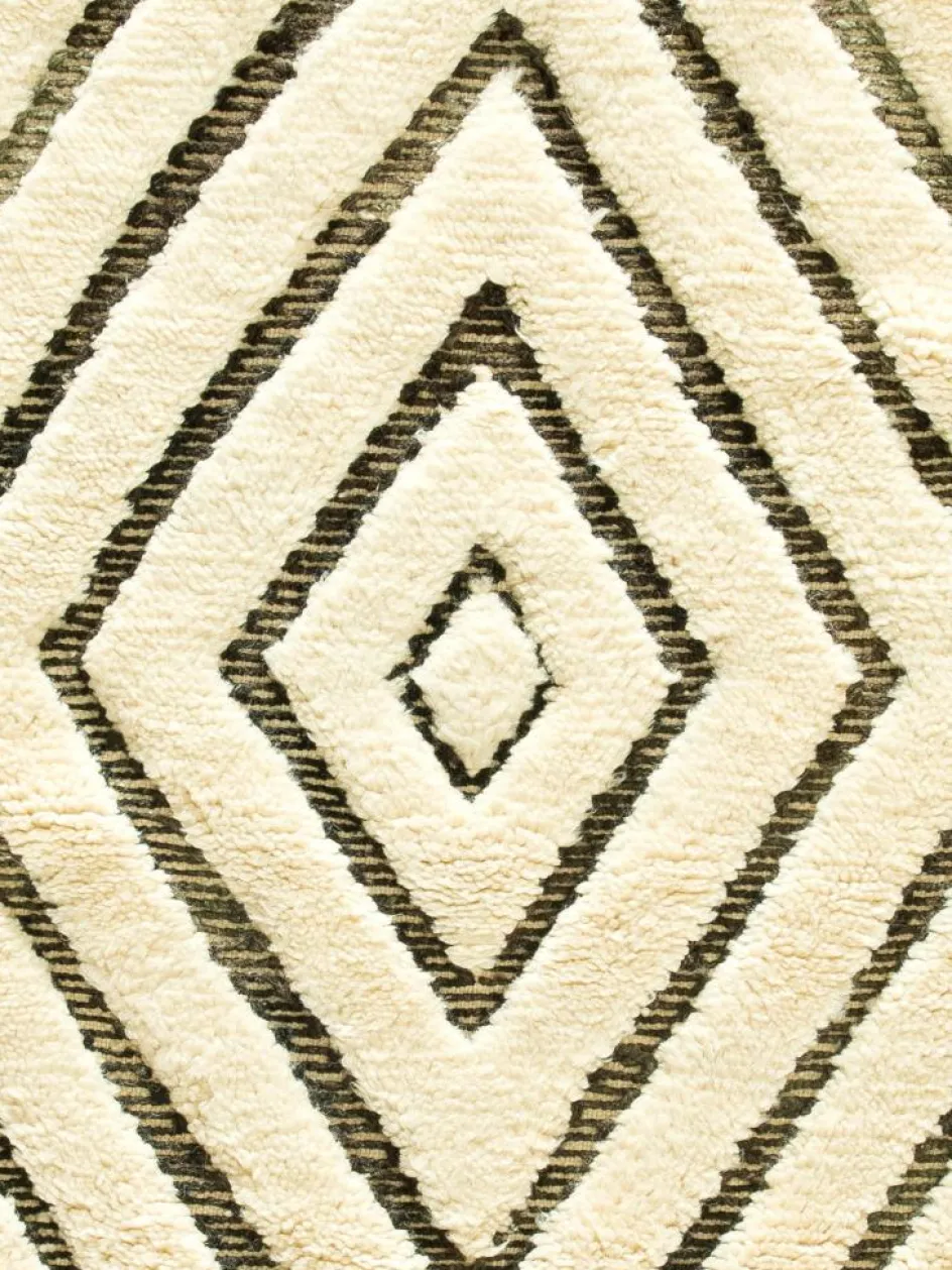 . Die Teppiche sind fast immer weißgrundig und zeichnen sich durch schwarze Zickzack-, Gitter- oder Rauten-Muster sowie einem wohnlich-zotteligen Flor aus. Kaum eine andere Teppichprovenienz passt mit ihren ursprünglichen nomadischen Designs besser in einen minimalistischen Wohnstil. Wie viele andere Nomadenteppiche auch, wurden dieBeni Ourain