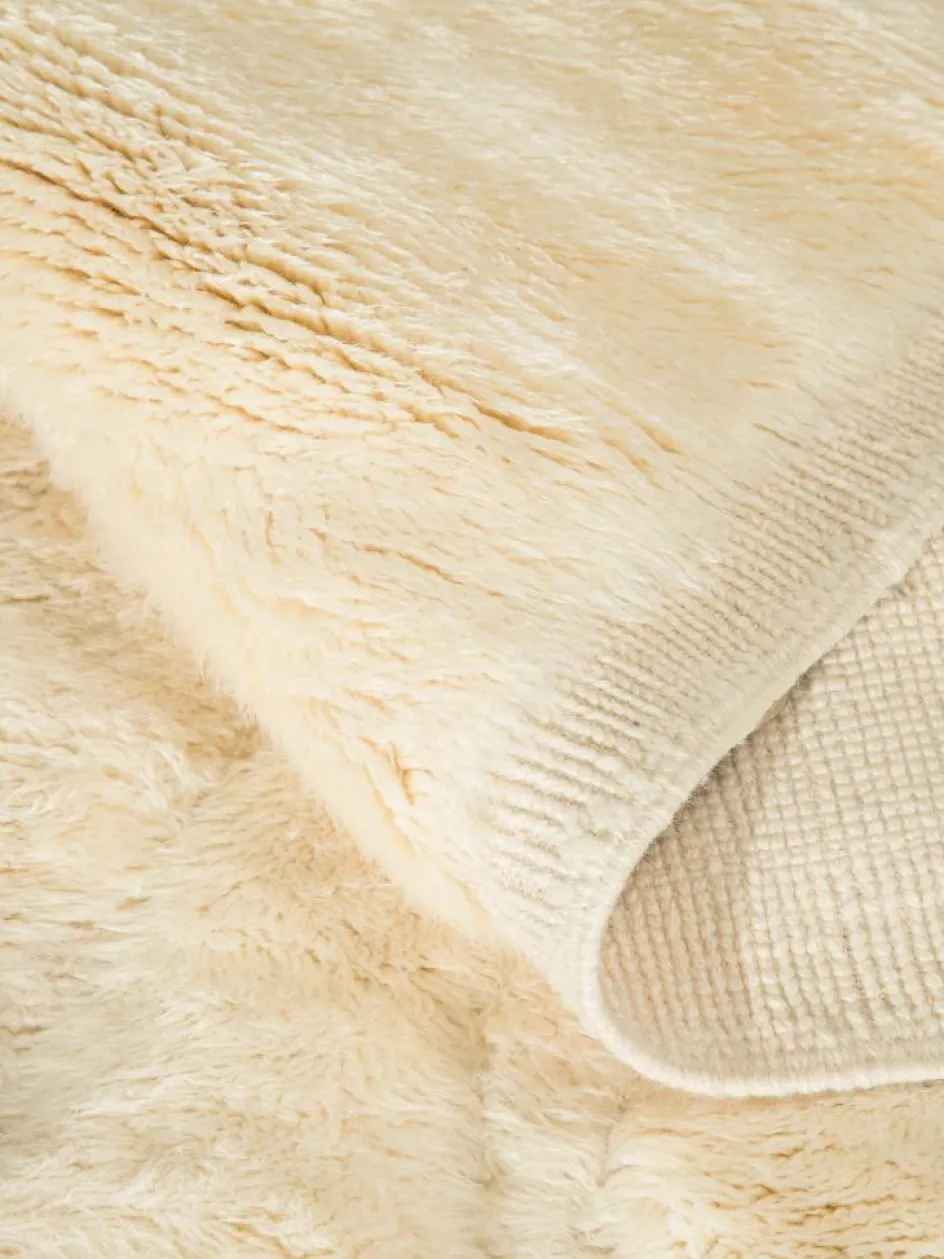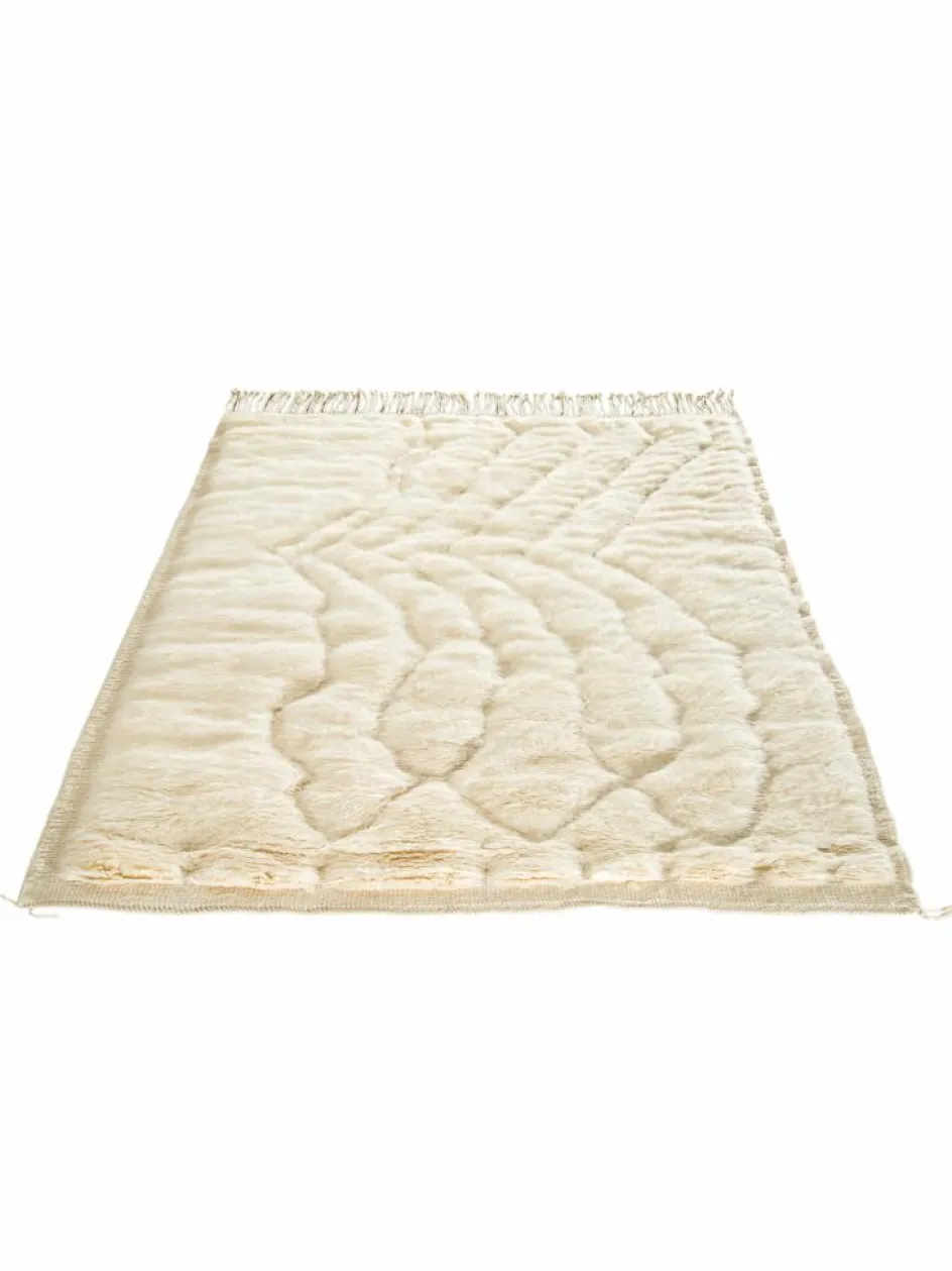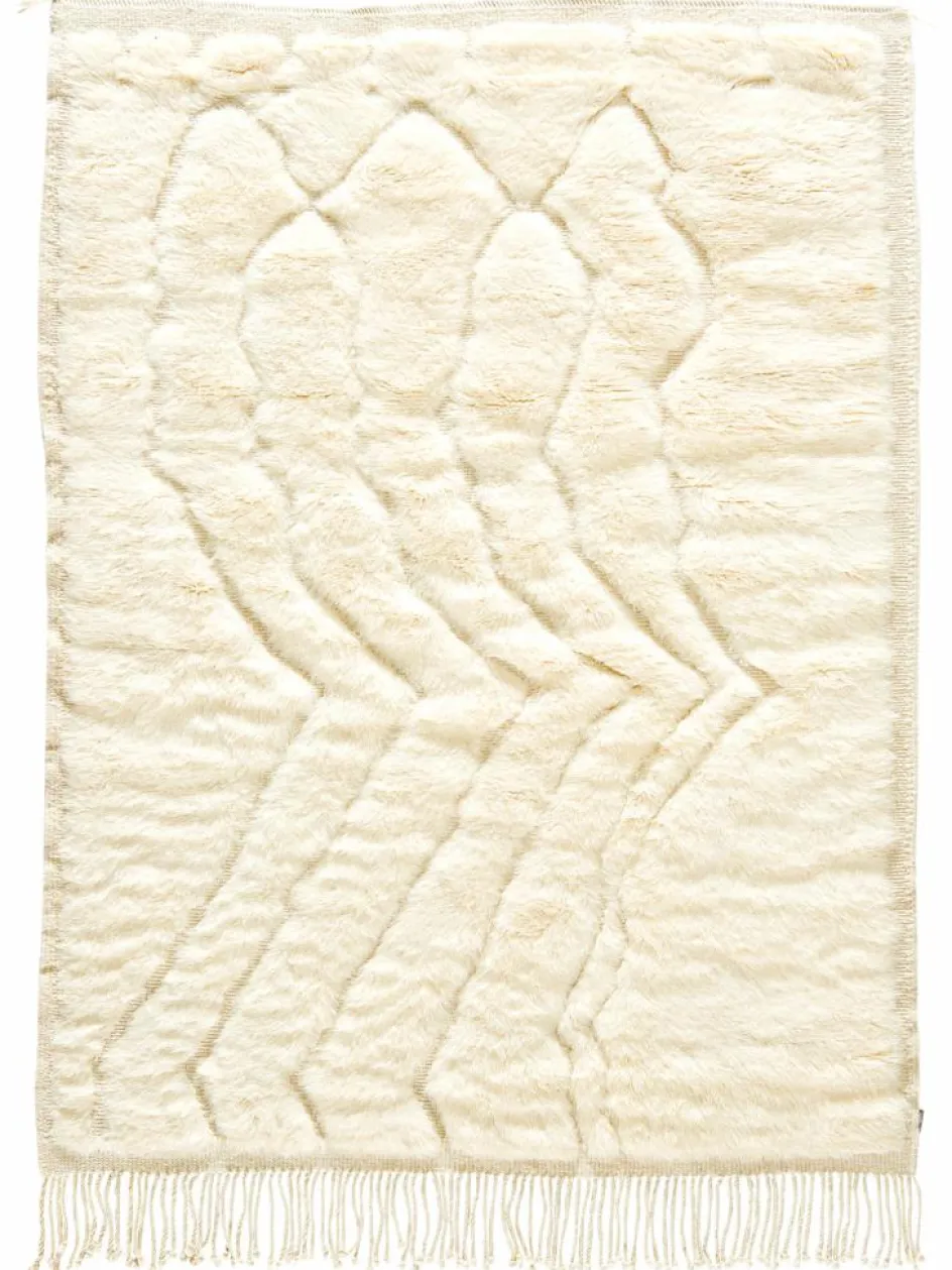 . Die Teppiche sind fast immer weißgrundig und zeichnen sich durch schwarze Zickzack-, Gitter- oder Rauten-Muster sowie einem wohnlich-zotteligen Flor aus. Kaum eine andere Teppichprovenienz passt mit ihren ursprünglichen nomadischen Designs besser in einen minimalistischen Wohnstil. Wie viele andere Nomadenteppiche auch, wurden dieBeni Ourain