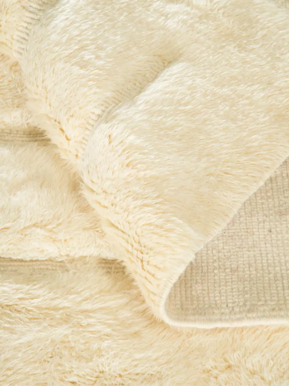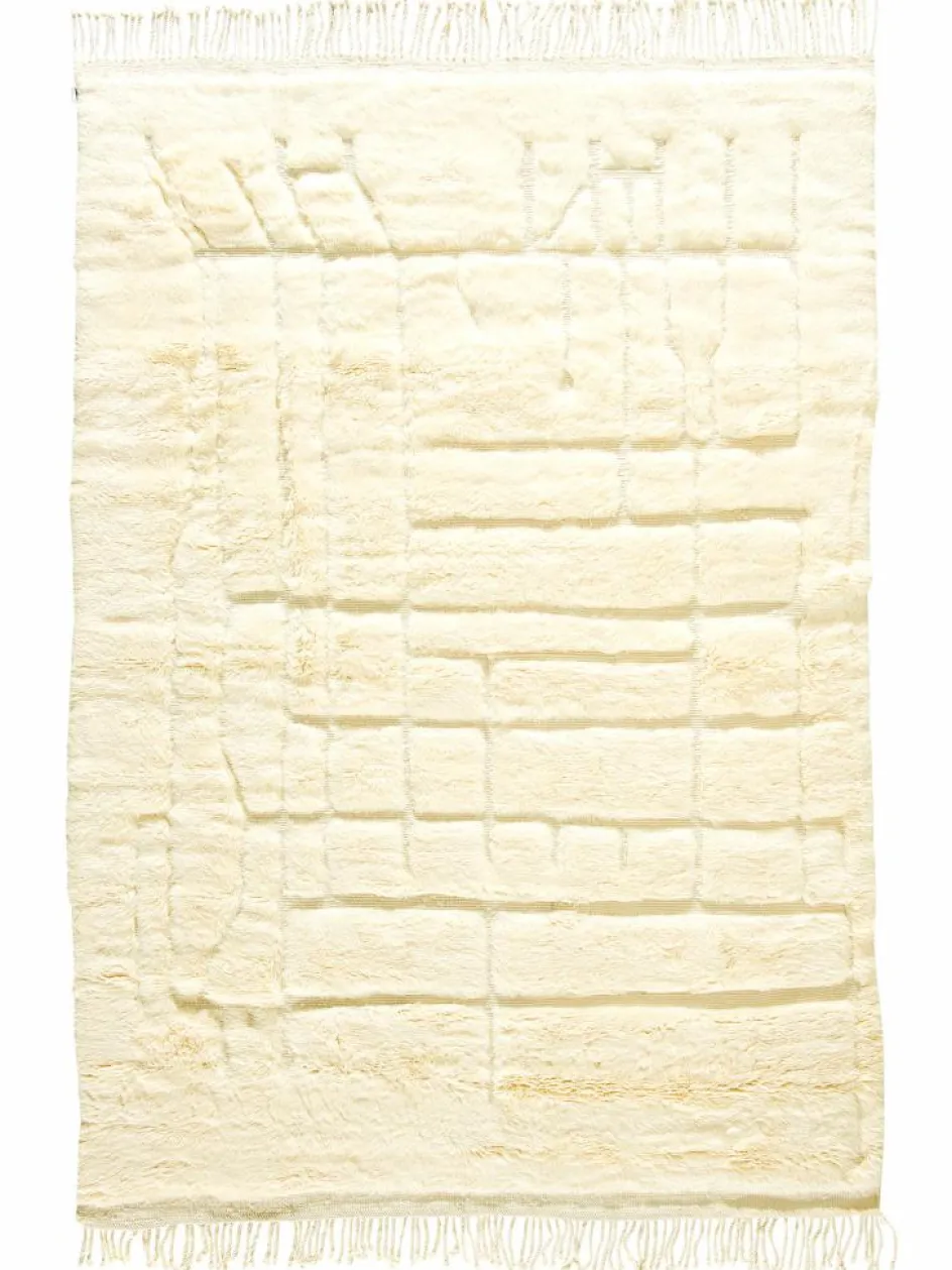 . Die Teppiche sind fast immer weißgrundig und zeichnen sich durch schwarze Zickzack-, Gitter- oder Rauten-Muster sowie einem wohnlich-zotteligen Flor aus. Kaum eine andere Teppichprovenienz passt mit ihren ursprünglichen nomadischen Designs besser in einen minimalistischen Wohnstil. Wie viele andere Nomadenteppiche auch, wurden dieBeni Ourain