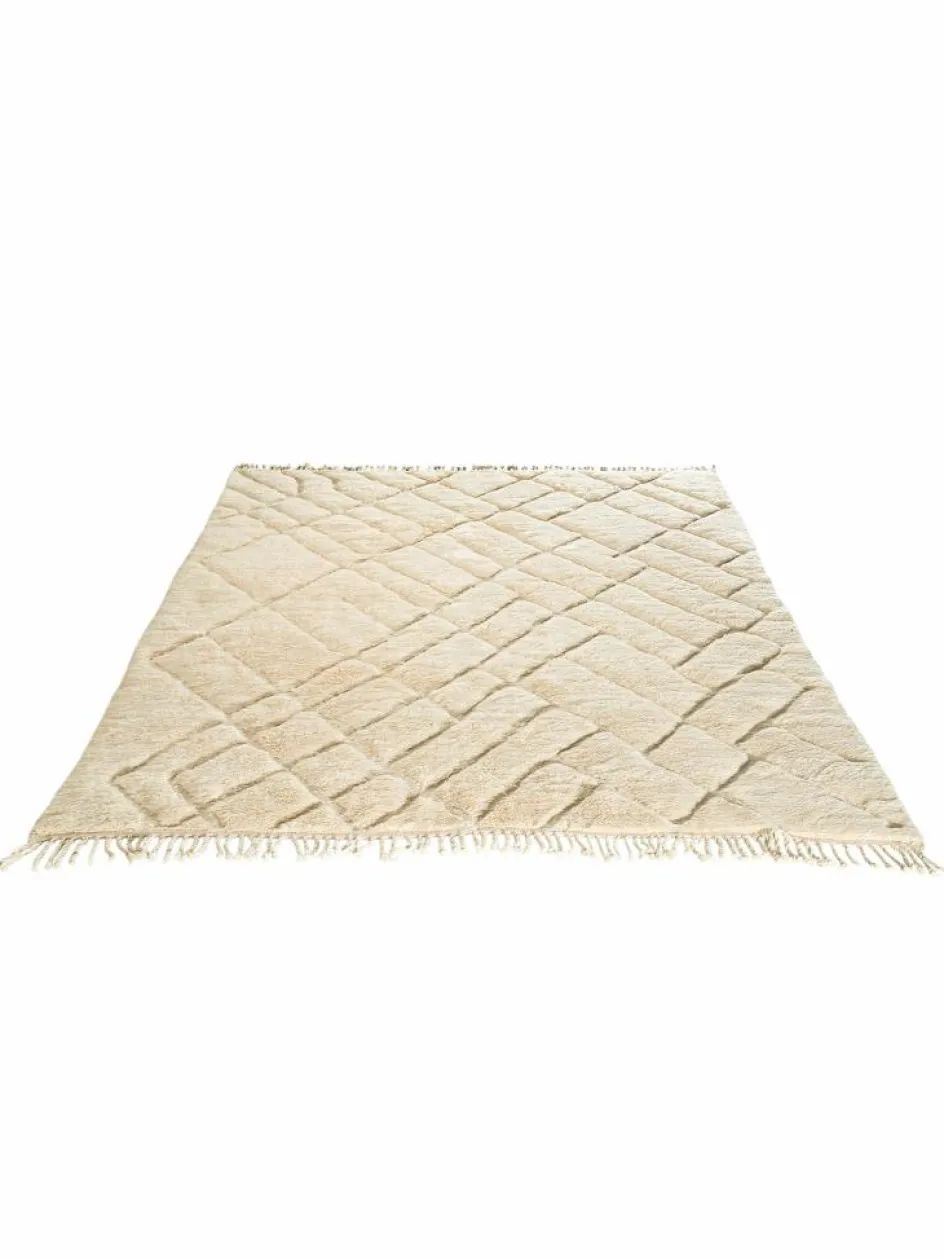. Die Teppiche sind fast immer weißgrundig und zeichnen sich durch schwarze Zickzack-, Gitter- oder Rauten-Muster sowie einem wohnlich-zotteligen Flor aus. Kaum eine andere Teppichprovenienz passt mit ihren ursprünglichen nomadischen Designs besser in einen minimalistischen Wohnstil. Wie viele andere Nomadenteppiche auch, wurden dieBeni Ourain
