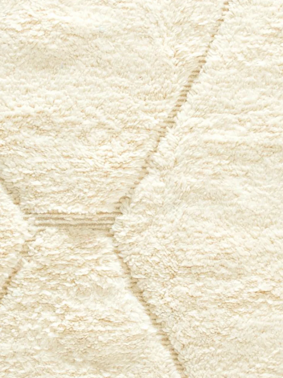 . Die Teppiche sind fast immer weißgrundig und zeichnen sich durch schwarze Zickzack-, Gitter- oder Rauten-Muster sowie einem wohnlich-zotteligen Flor aus. Kaum eine andere Teppichprovenienz passt mit ihren ursprünglichen nomadischen Designs besser in einen minimalistischen Wohnstil. Wie viele andere Nomadenteppiche auch, wurden dieBeni Ourain