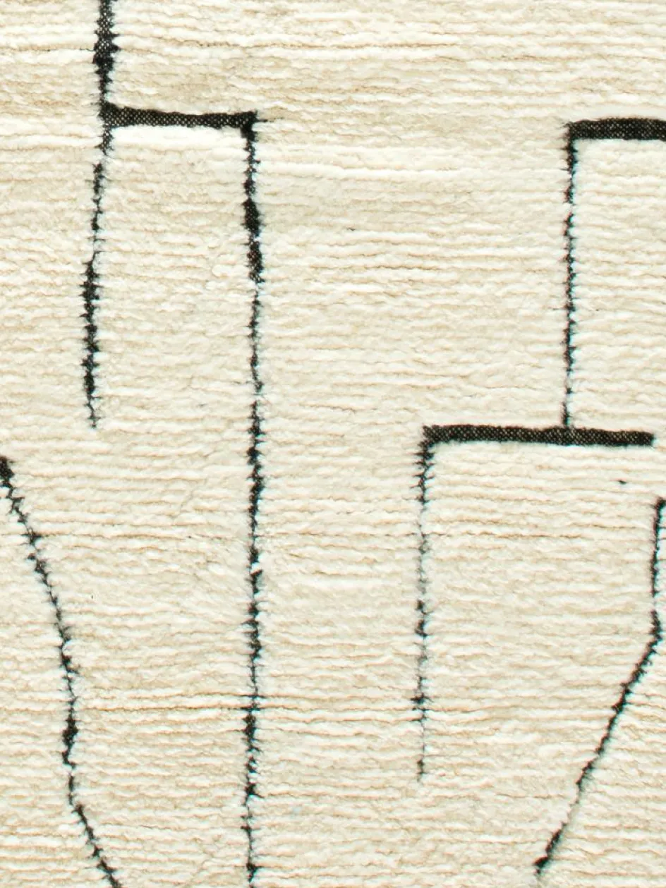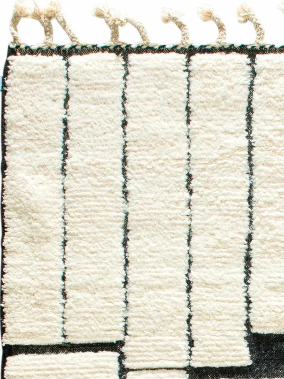 . Die Teppiche sind fast immer weißgrundig und zeichnen sich durch schwarze Zickzack-, Gitter- oder Rauten-Muster sowie einem wohnlich-zotteligen Flor aus. Kaum eine andere Teppichprovenienz passt mit ihren ursprünglichen nomadischen Designs besser in einen minimalistischen Wohnstil. Wie viele andere Nomadenteppiche auch, wurden dieBeni Ourain