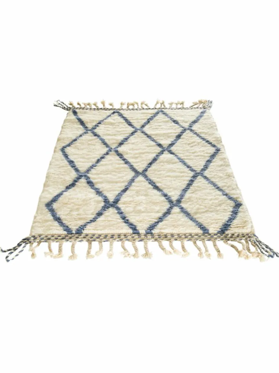 . Die Teppiche sind fast immer weißgrundig und zeichnen sich durch schwarze Zickzack-, Gitter- oder Rauten-Muster sowie einem wohnlich-zotteligen Flor aus. Kaum eine andere Teppichprovenienz passt mit ihren ursprünglichen nomadischen Designs besser in einen minimalistischen Wohnstil. Wie viele andere Nomadenteppiche auch, wurden dieBeni Ourain