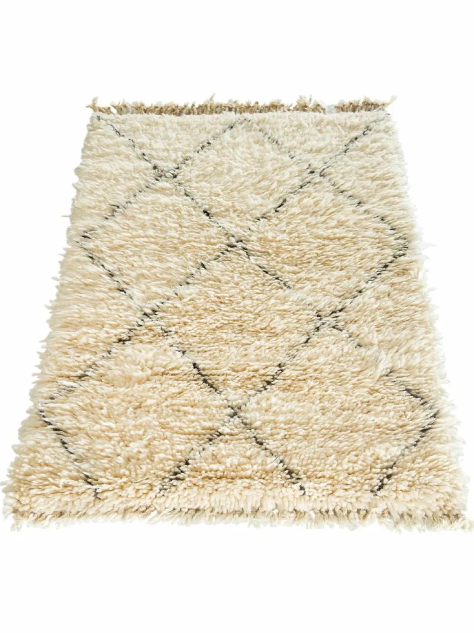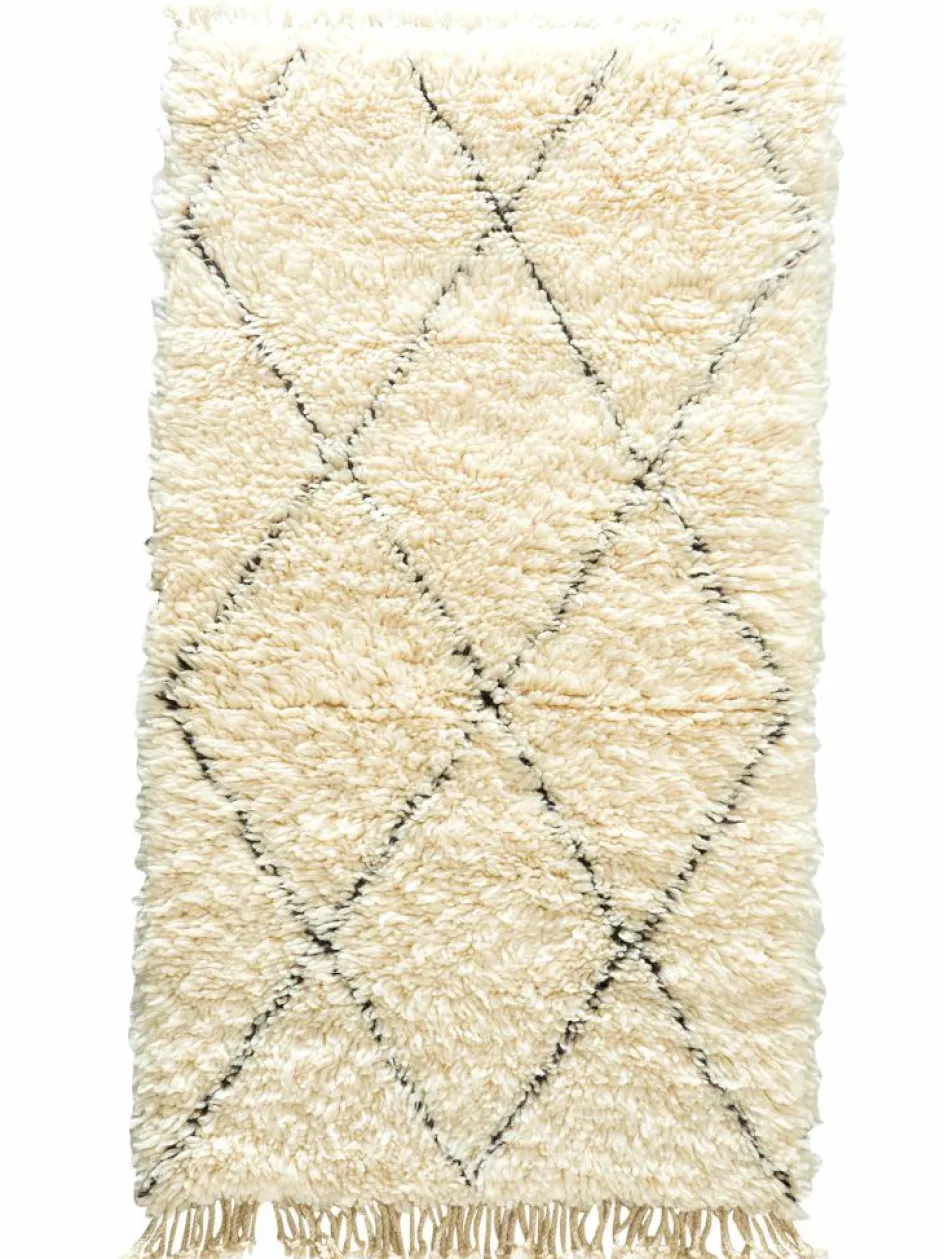 . Die Teppiche sind fast immer weißgrundig und zeichnen sich durch schwarze Zickzack-, Gitter- oder Rauten-Muster sowie einem wohnlich-zotteligen Flor aus. Kaum eine andere Teppichprovenienz passt mit ihren ursprünglichen nomadischen Designs besser in einen minimalistischen Wohnstil. Wie viele andere Nomadenteppiche auch, wurden dieBeni Ourain