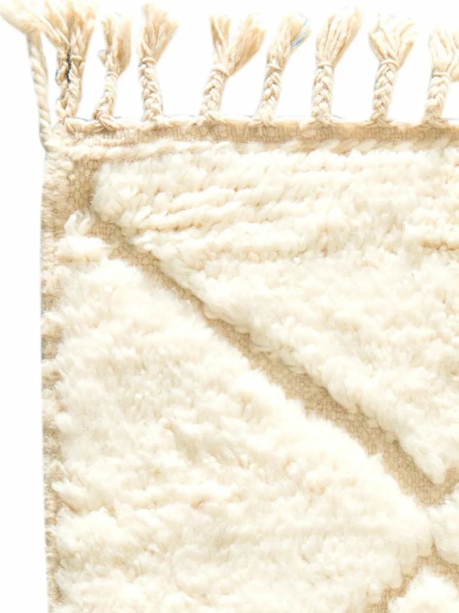 . Die Teppiche sind fast immer weißgrundig und zeichnen sich durch schwarze Zickzack-, Gitter- oder Rauten-Muster sowie einem wohnlich-zotteligen Flor aus. Kaum eine andere Teppichprovenienz passt mit ihren ursprünglichen nomadischen Designs besser in einen minimalistischen Wohnstil. Wie viele andere Nomadenteppiche auch, wurden dieBeni Ourain