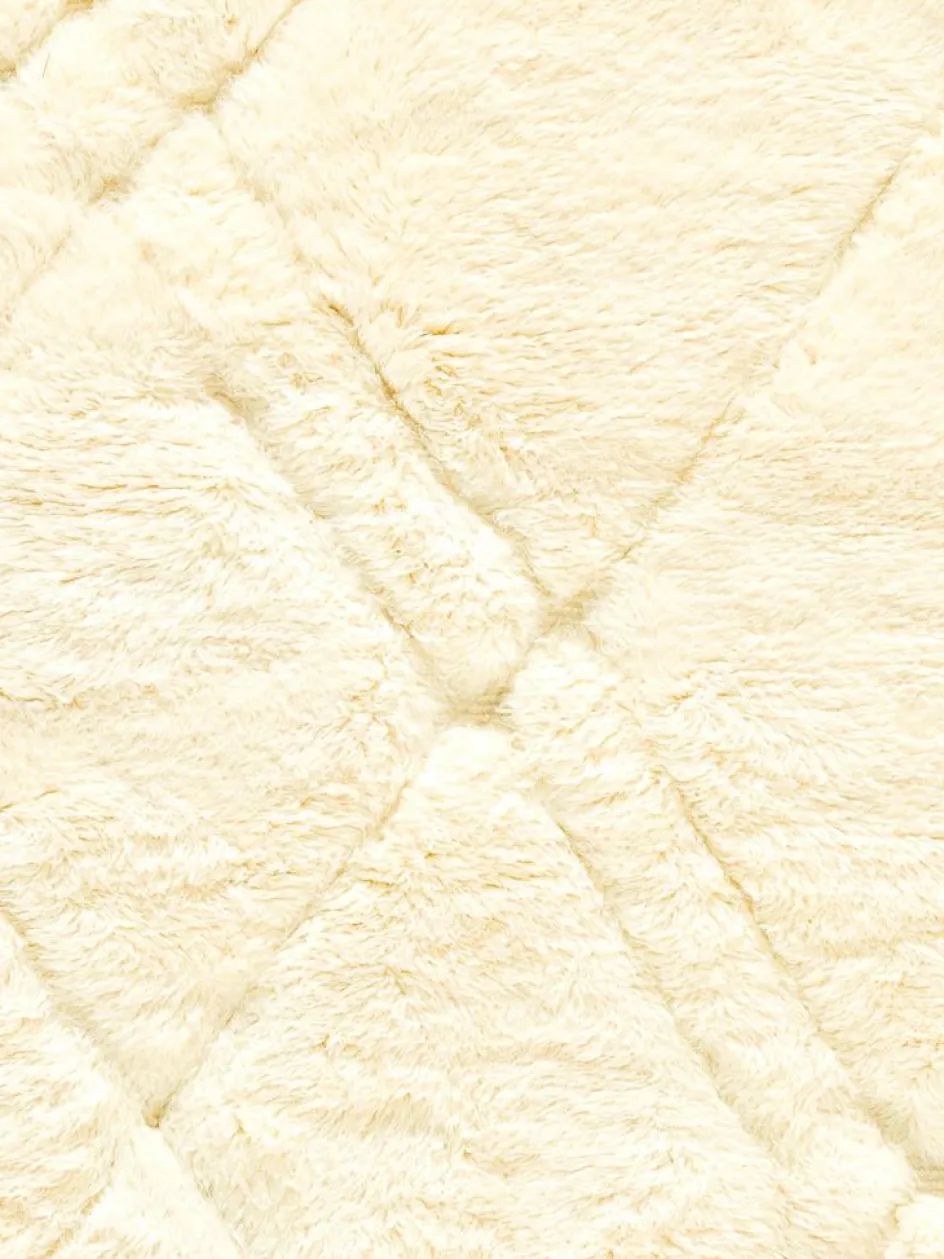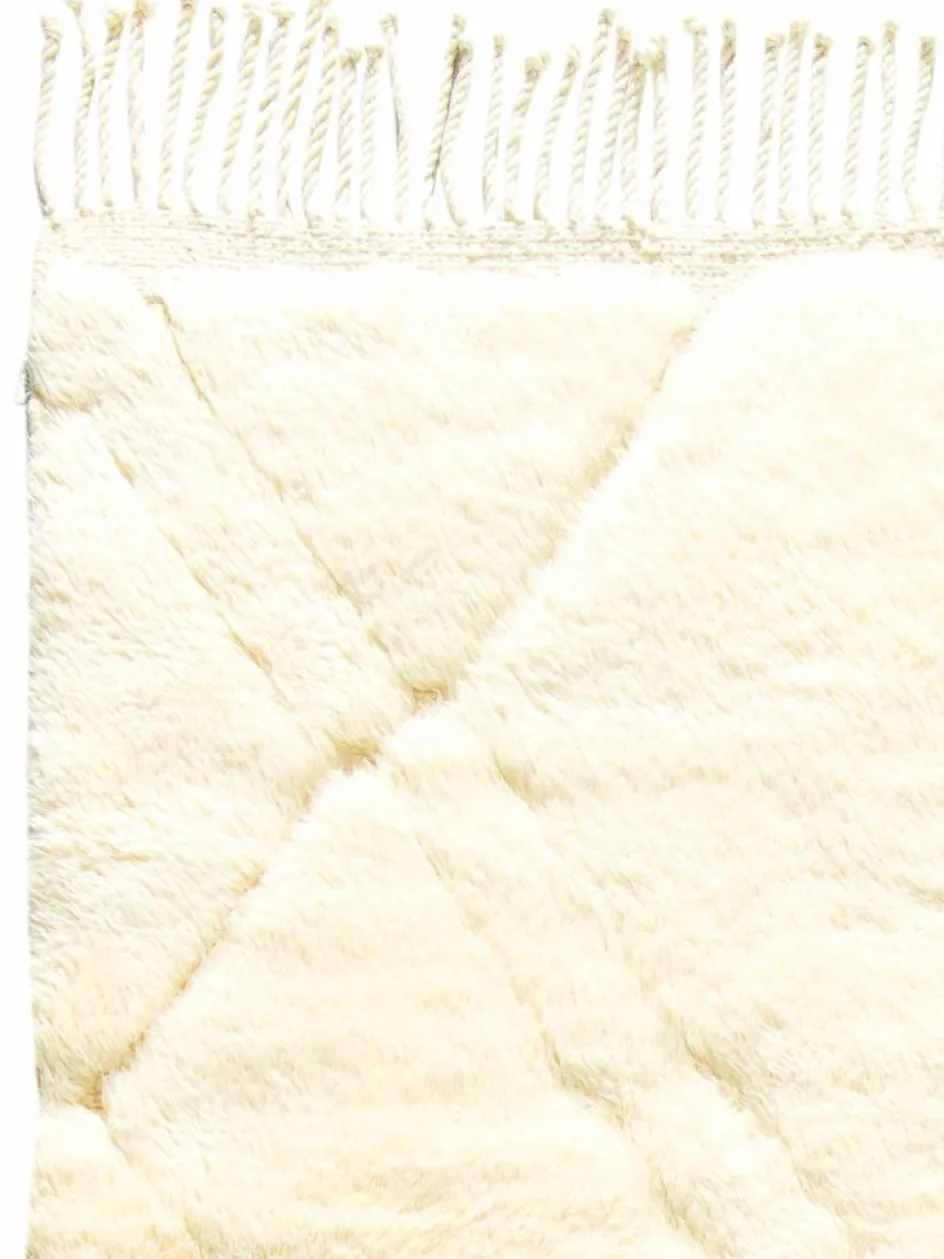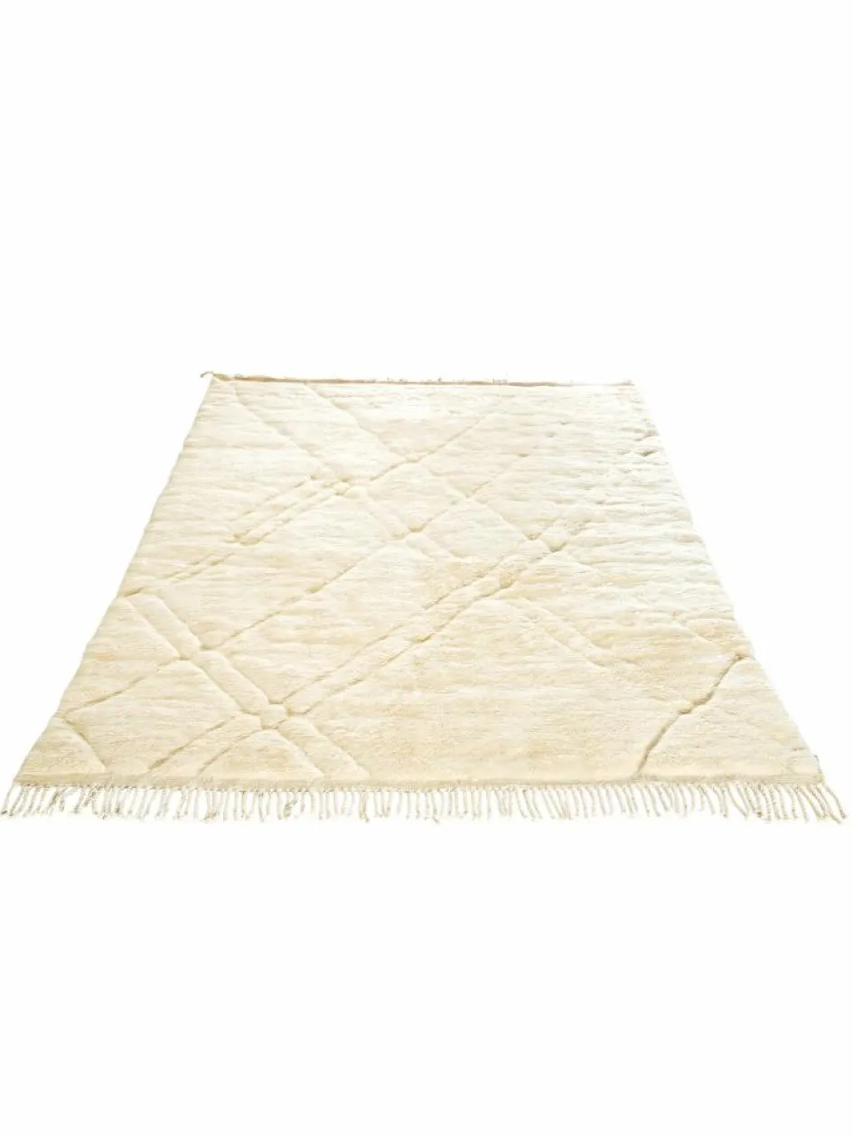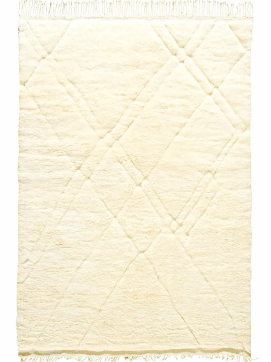 . Die Teppiche sind fast immer weißgrundig und zeichnen sich durch schwarze Zickzack-, Gitter- oder Rauten-Muster sowie einem wohnlich-zotteligen Flor aus. Kaum eine andere Teppichprovenienz passt mit ihren ursprünglichen nomadischen Designs besser in einen minimalistischen Wohnstil. Wie viele andere Nomadenteppiche auch, wurden dieBeni Ourain