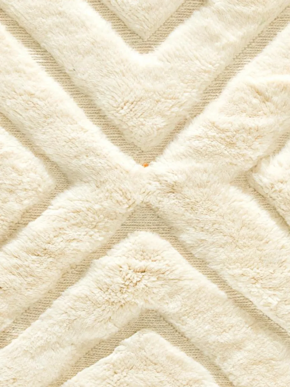 . Die Teppiche sind fast immer weißgrundig und zeichnen sich durch schwarze Zickzack-, Gitter- oder Rauten-Muster sowie einem wohnlich-zotteligen Flor aus. Kaum eine andere Teppichprovenienz passt mit ihren ursprünglichen nomadischen Designs besser in einen minimalistischen Wohnstil. Wie viele andere Nomadenteppiche auch, wurden dieBeni Ourain