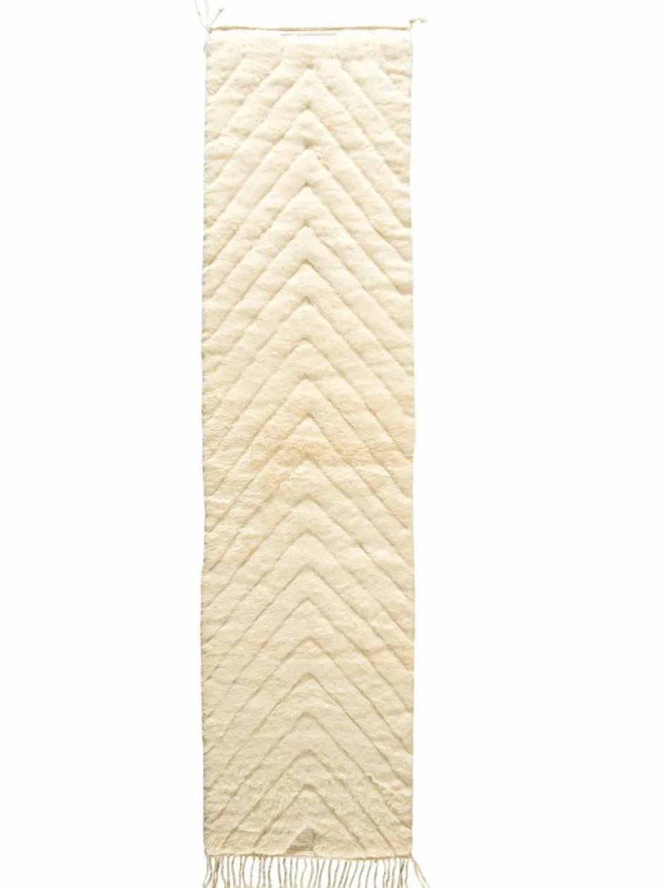 . Die Teppiche sind fast immer weißgrundig und zeichnen sich durch schwarze Zickzack-, Gitter- oder Rauten-Muster sowie einem wohnlich-zotteligen Flor aus. Kaum eine andere Teppichprovenienz passt mit ihren ursprünglichen nomadischen Designs besser in einen minimalistischen Wohnstil. Wie viele andere Nomadenteppiche auch, wurden dieBeni Ourain