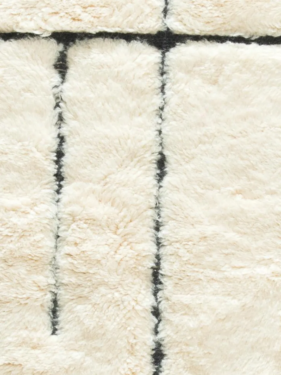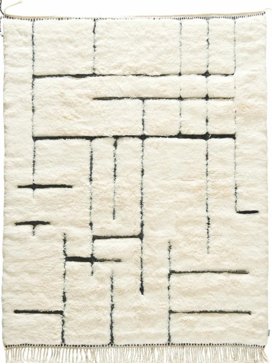 . Die Teppiche sind fast immer weißgrundig und zeichnen sich durch schwarze Zickzack-, Gitter- oder Rauten-Muster sowie einem wohnlich-zotteligen Flor aus. Kaum eine andere Teppichprovenienz passt mit ihren ursprünglichen nomadischen Designs besser in einen minimalistischen Wohnstil. Wie viele andere Nomadenteppiche auch, wurden dieBeni Ourain