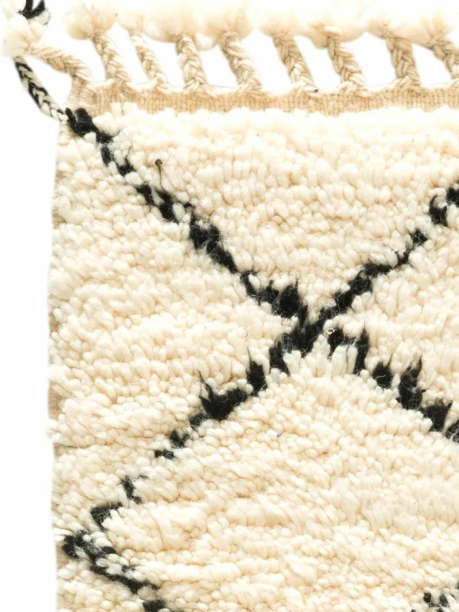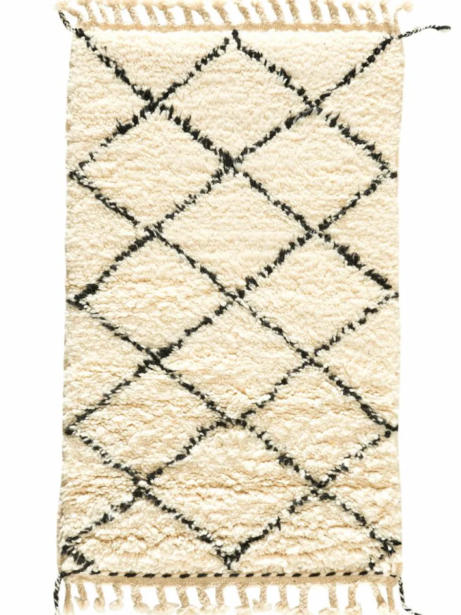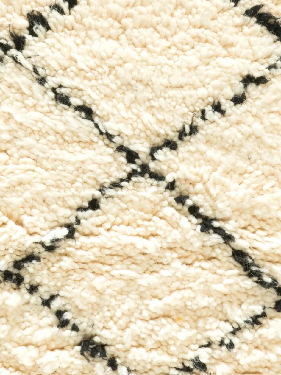 . Die Teppiche sind fast immer weißgrundig und zeichnen sich durch schwarze Zickzack-, Gitter- oder Rauten-Muster sowie einem wohnlich-zotteligen Flor aus. Kaum eine andere Teppichprovenienz passt mit ihren ursprünglichen nomadischen Designs besser in einen minimalistischen Wohnstil. Wie viele andere Nomadenteppiche auch, wurden dieBeni Ourain