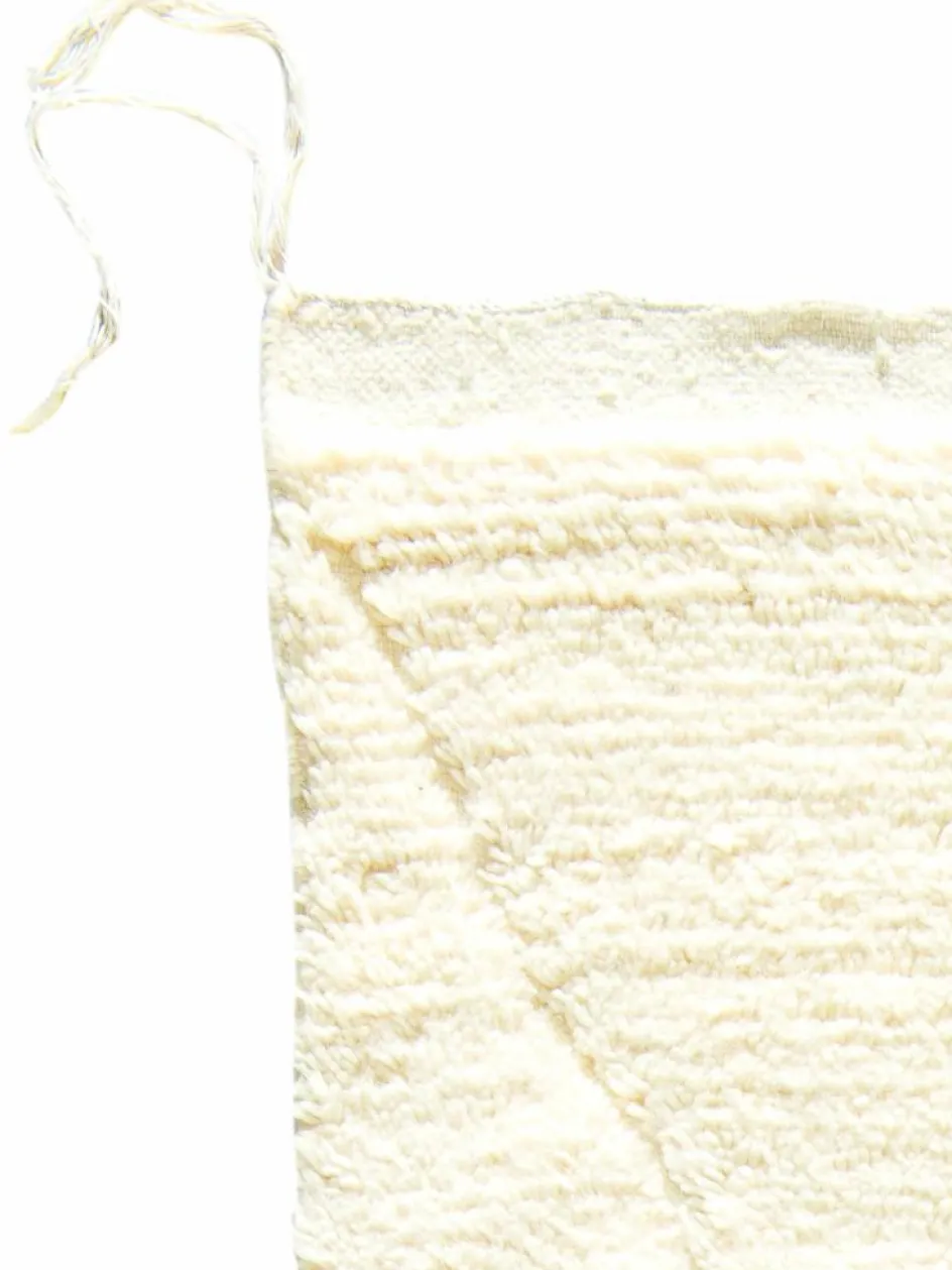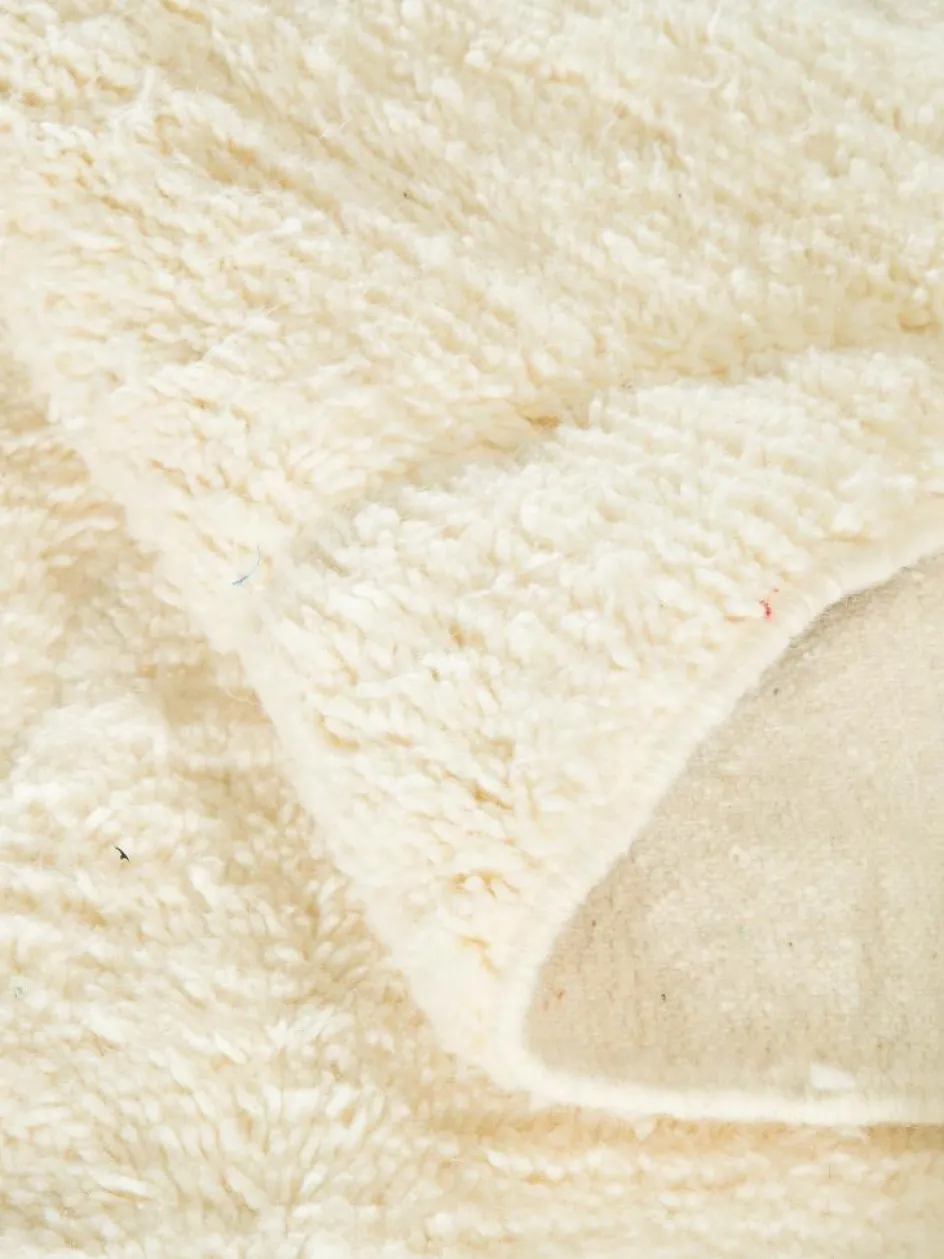 . Die Teppiche sind fast immer weißgrundig und zeichnen sich durch schwarze Zickzack-, Gitter- oder Rauten-Muster sowie einem wohnlich-zotteligen Flor aus. Kaum eine andere Teppichprovenienz passt mit ihren ursprünglichen nomadischen Designs besser in einen minimalistischen Wohnstil. Wie viele andere Nomadenteppiche auch, wurden dieBeni Ourain