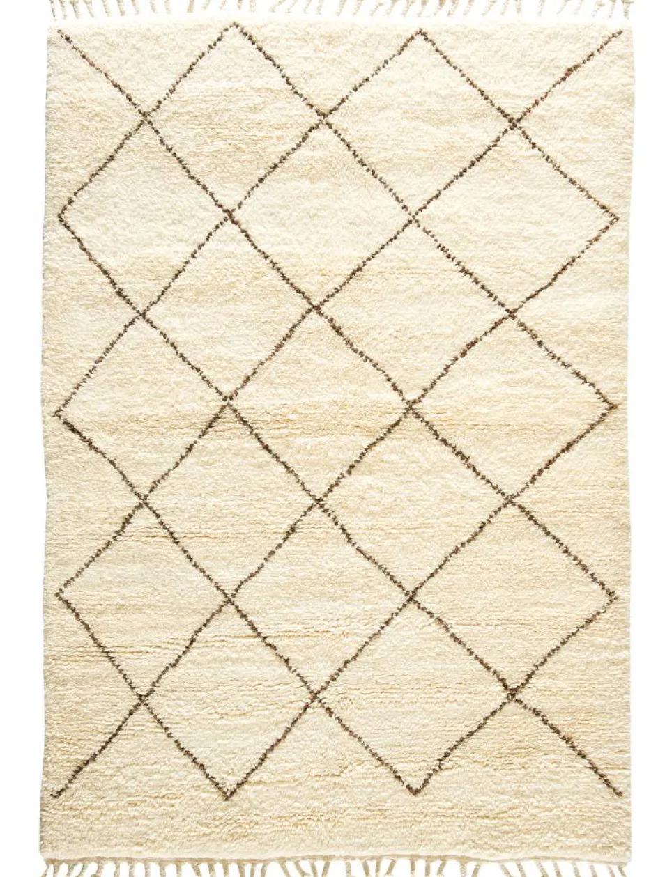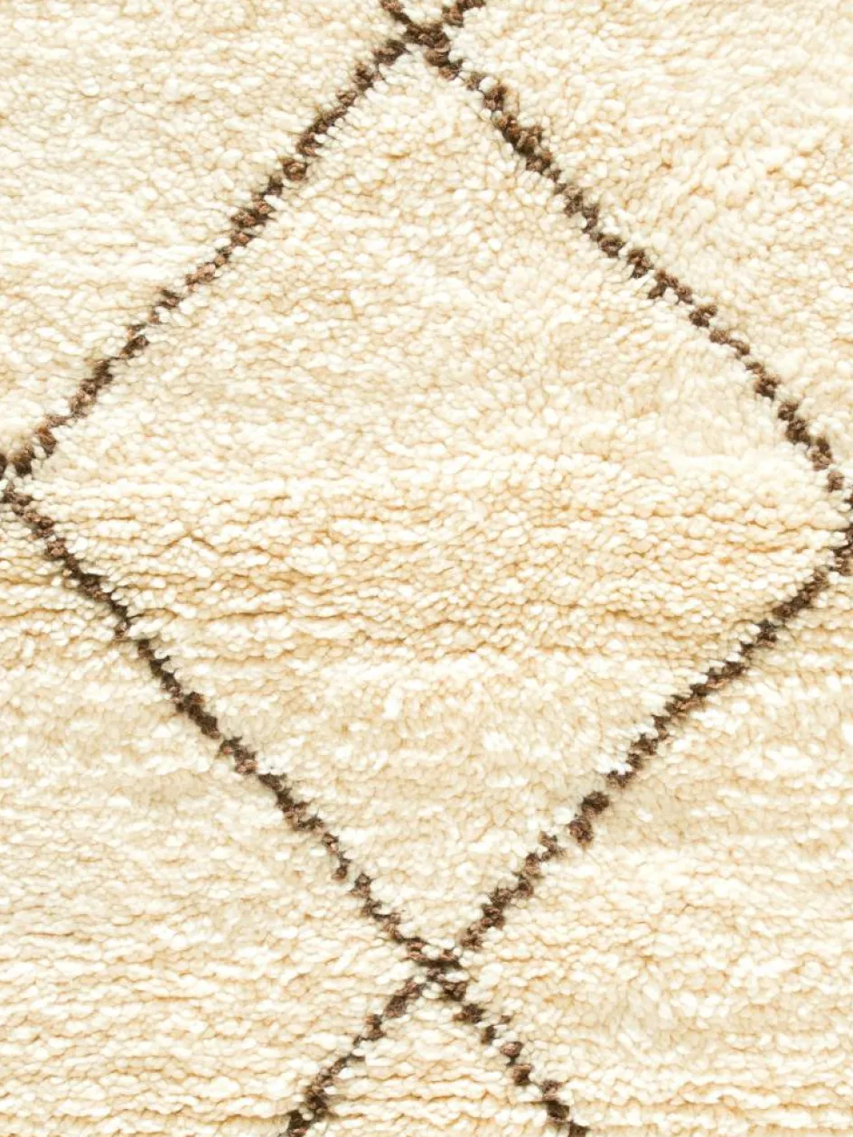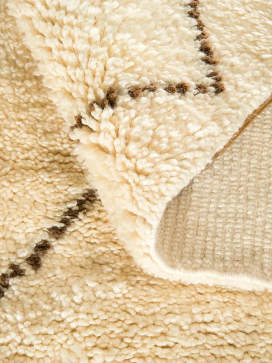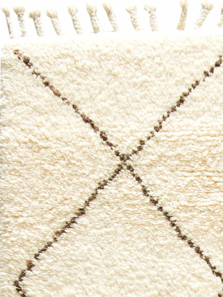 . Die Teppiche sind fast immer weißgrundig und zeichnen sich durch schwarze Zickzack-, Gitter- oder Rauten-Muster sowie einem wohnlich-zotteligen Flor aus. Kaum eine andere Teppichprovenienz passt mit ihren ursprünglichen nomadischen Designs besser in einen minimalistischen Wohnstil. Wie viele andere Nomadenteppiche auch, wurden dieBeni Ourain