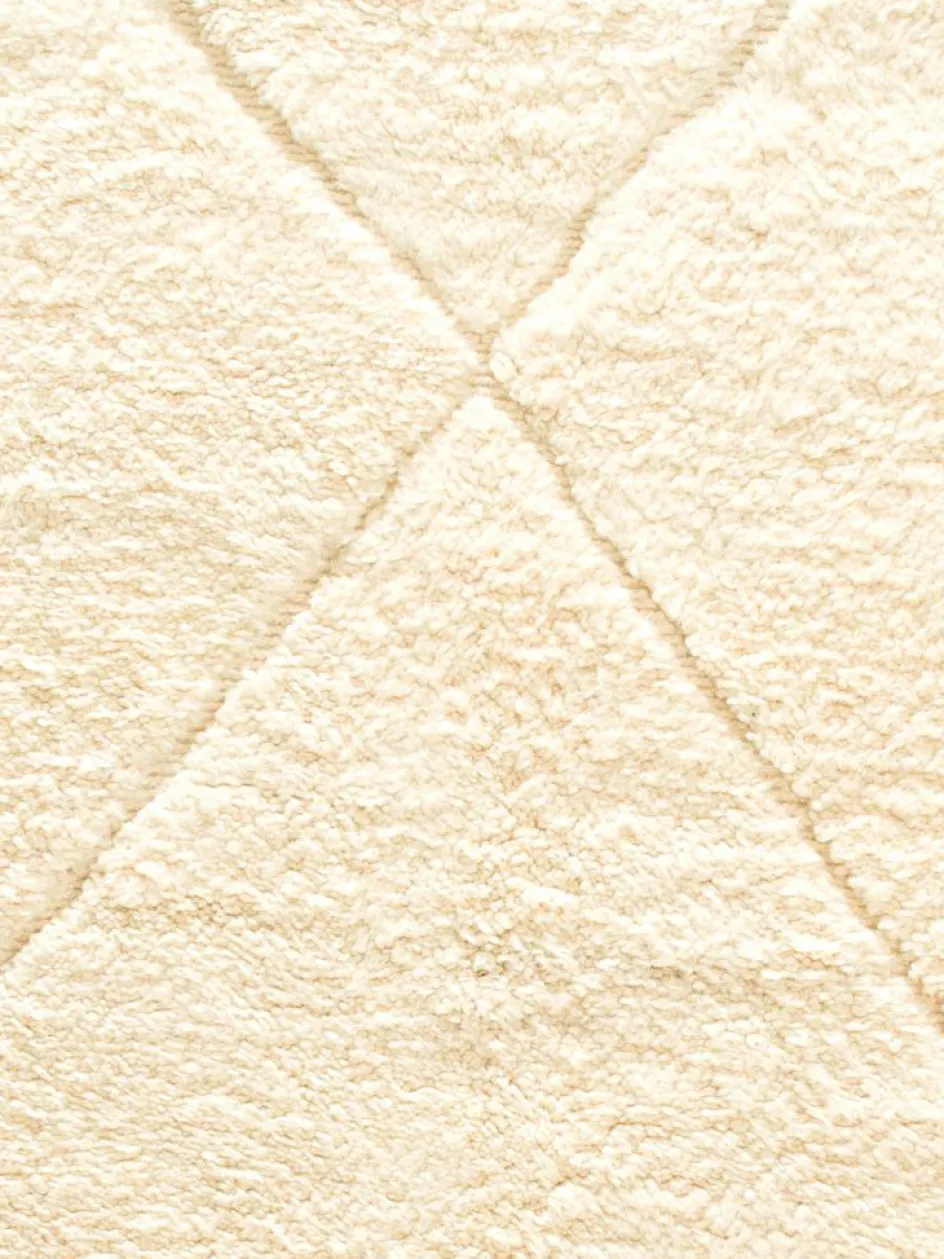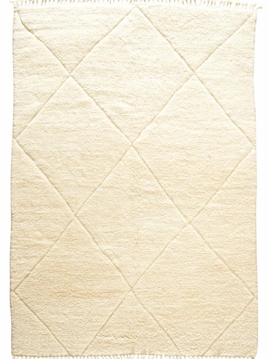 . Die Teppiche sind fast immer weißgrundig und zeichnen sich durch schwarze Zickzack-, Gitter- oder Rauten-Muster sowie einem wohnlich-zotteligen Flor aus. Kaum eine andere Teppichprovenienz passt mit ihren ursprünglichen nomadischen Designs besser in einen minimalistischen Wohnstil. Wie viele andere Nomadenteppiche auch, wurden dieBeni Ourain