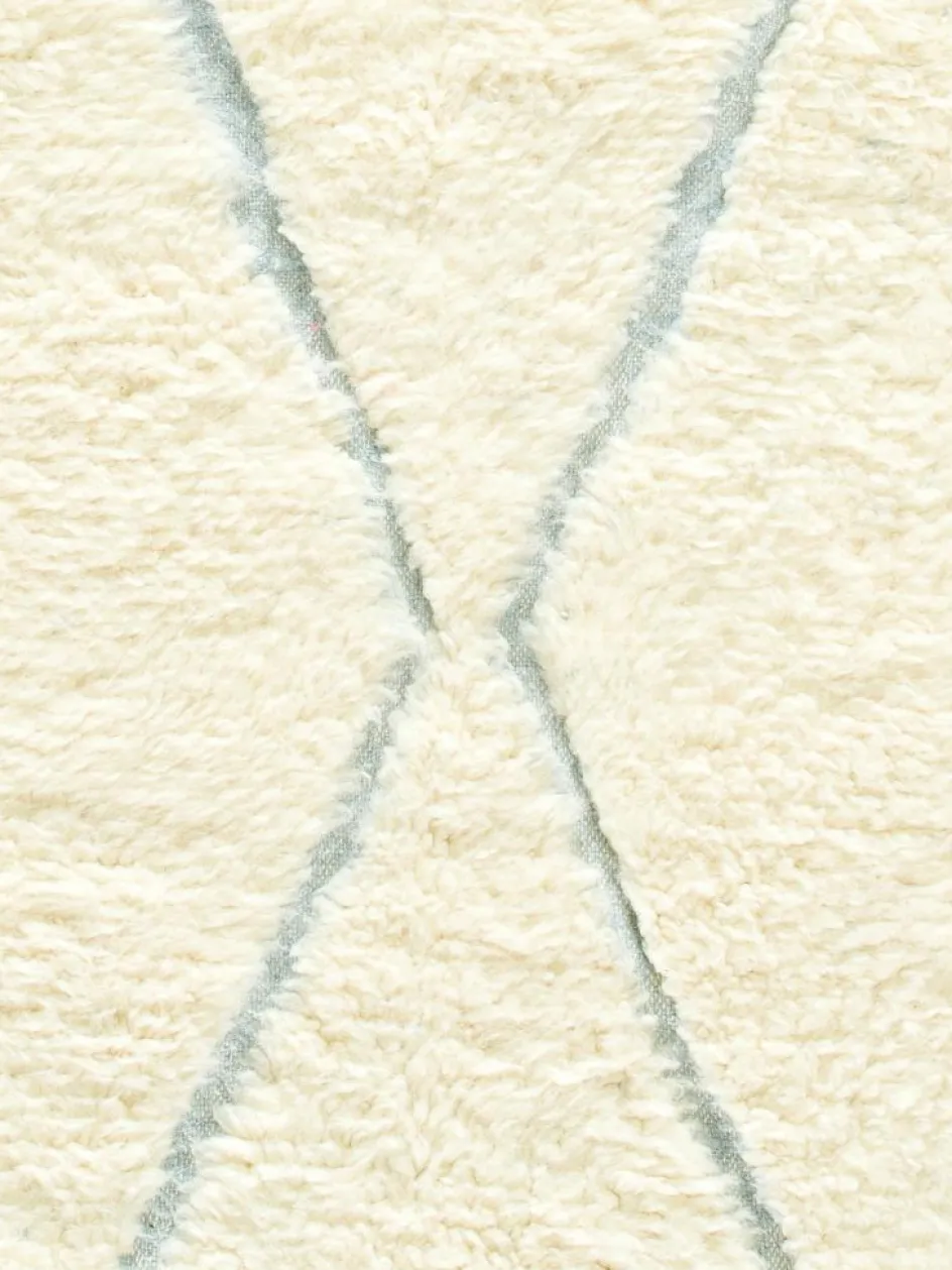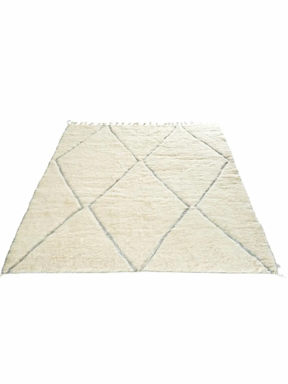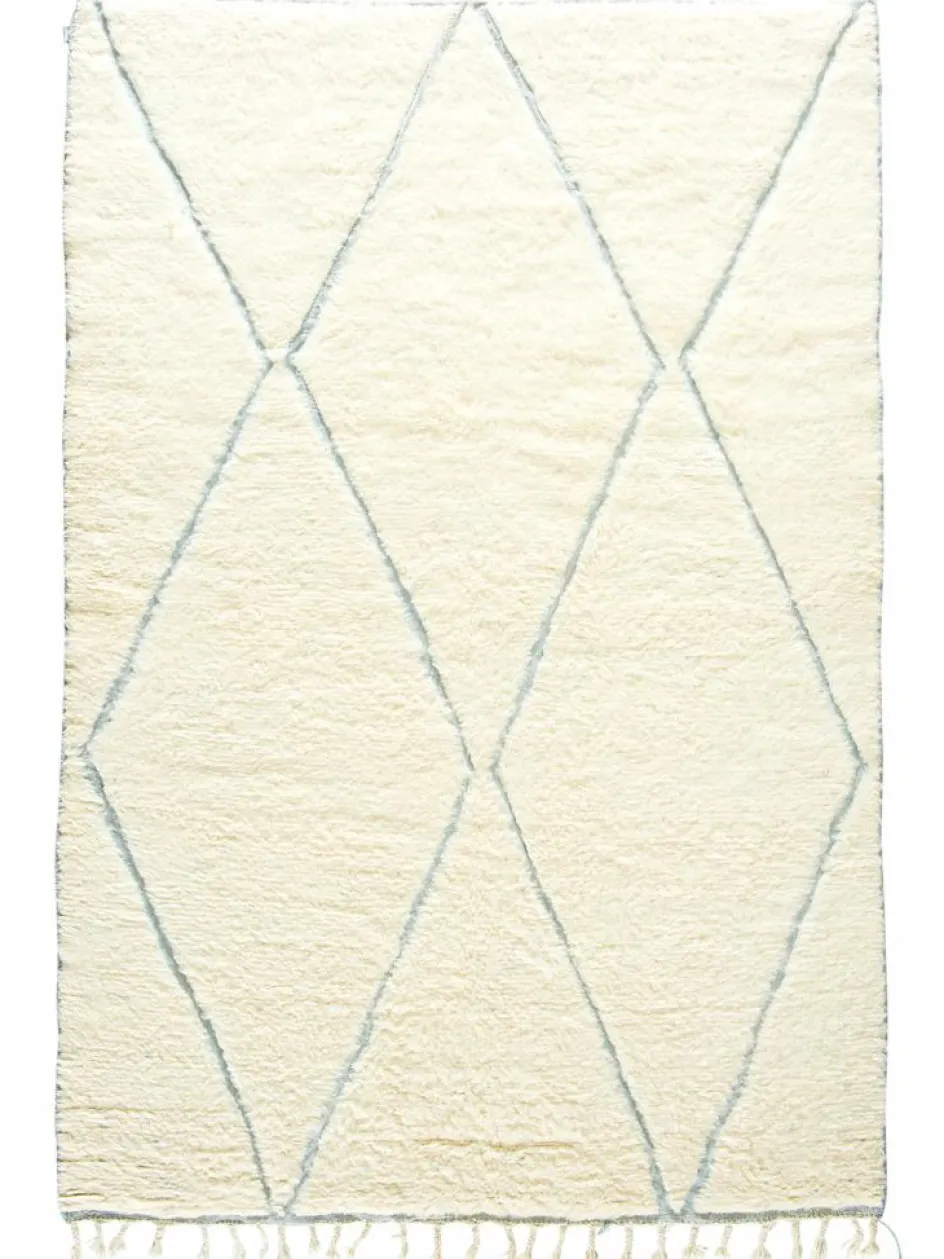 . Die Teppiche sind fast immer weißgrundig und zeichnen sich durch schwarze Zickzack-, Gitter- oder Rauten-Muster sowie einem wohnlich-zotteligen Flor aus. Kaum eine andere Teppichprovenienz passt mit ihren ursprünglichen nomadischen Designs besser in einen minimalistischen Wohnstil. Wie viele andere Nomadenteppiche auch, wurden dieBeni Ourain