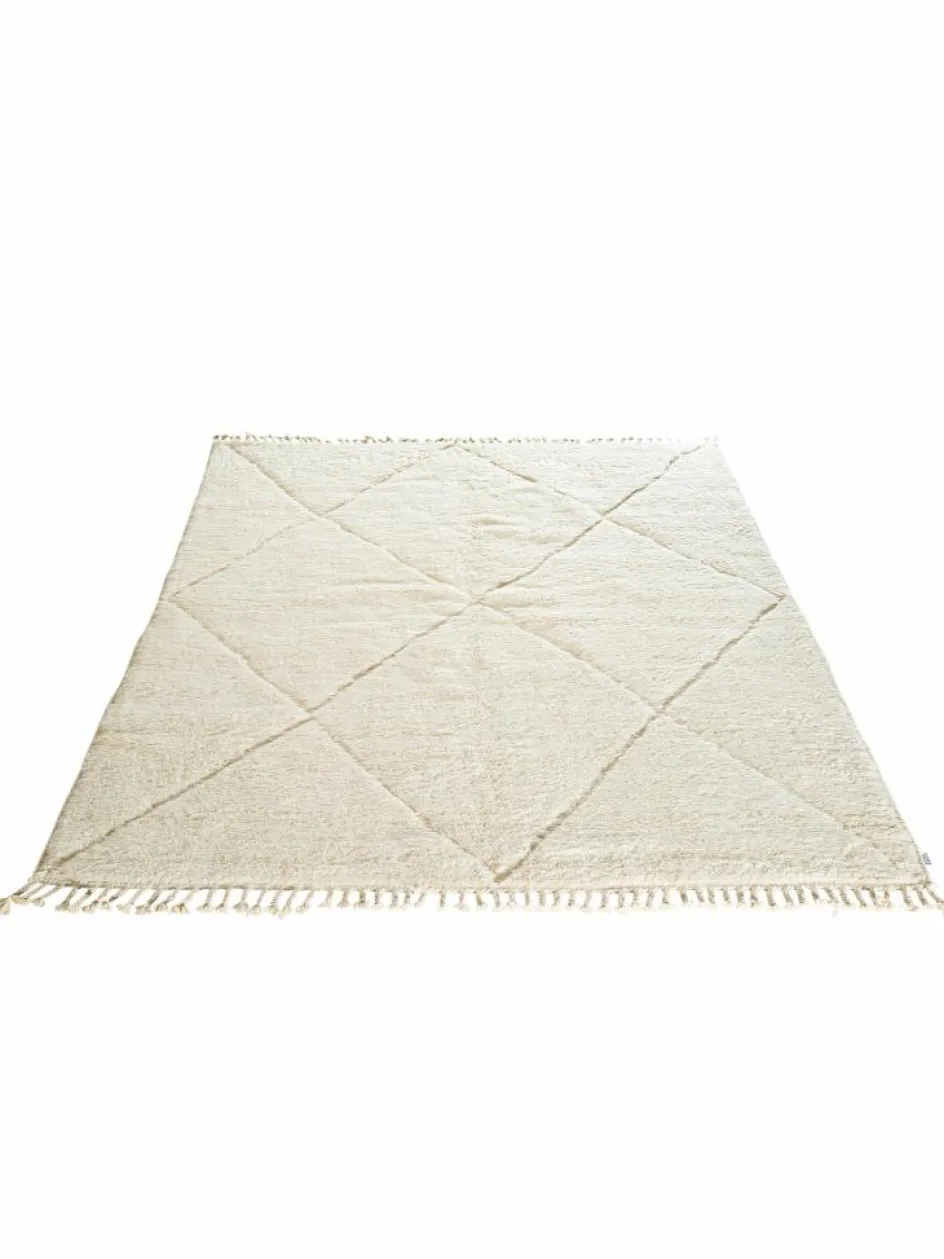 . Die Teppiche sind fast immer weißgrundig und zeichnen sich durch schwarze Zickzack-, Gitter- oder Rauten-Muster sowie einem wohnlich-zotteligen Flor aus. Kaum eine andere Teppichprovenienz passt mit ihren ursprünglichen nomadischen Designs besser in einen minimalistischen Wohnstil. Wie viele andere Nomadenteppiche auch, wurden dieBeni Ourain