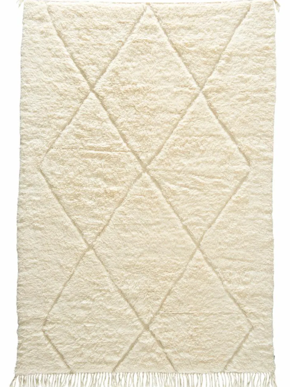 . Die Teppiche sind fast immer weißgrundig und zeichnen sich durch schwarze Zickzack-, Gitter- oder Rauten-Muster sowie einem wohnlich-zotteligen Flor aus. Kaum eine andere Teppichprovenienz passt mit ihren ursprünglichen nomadischen Designs besser in einen minimalistischen Wohnstil. Wie viele andere Nomadenteppiche auch, wurden dieBeni Ourain