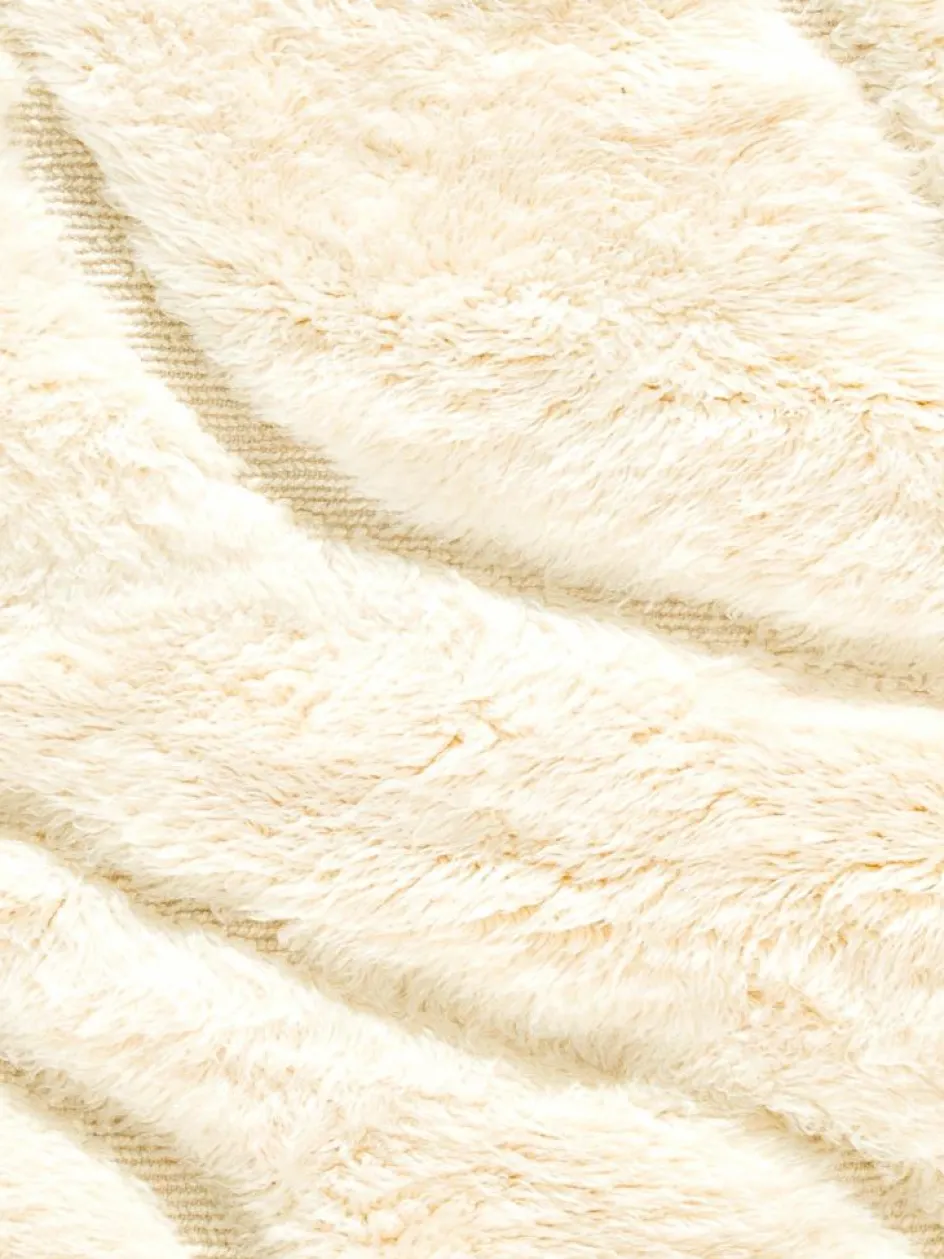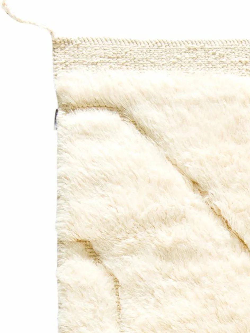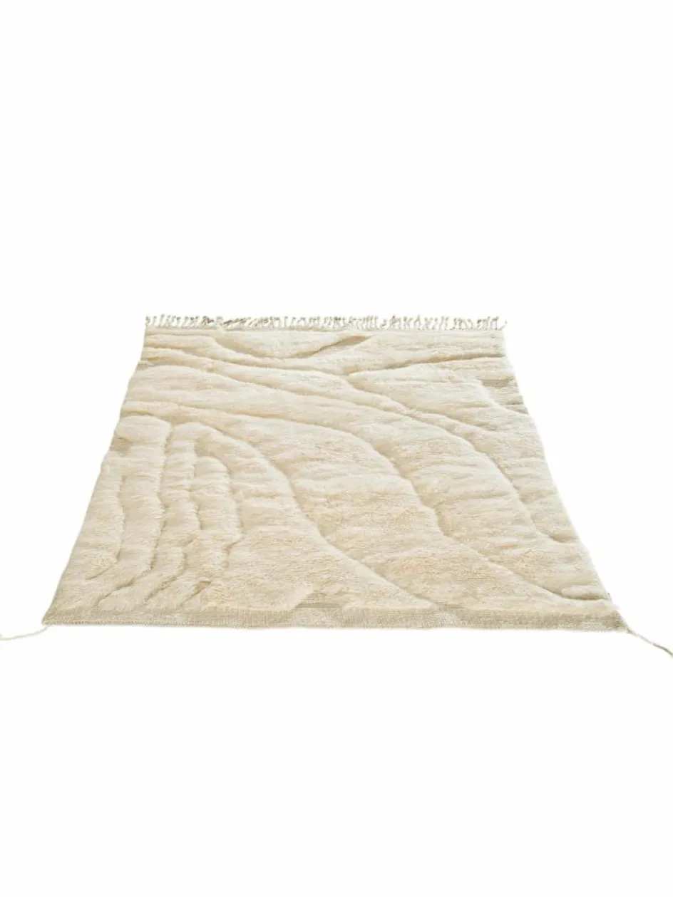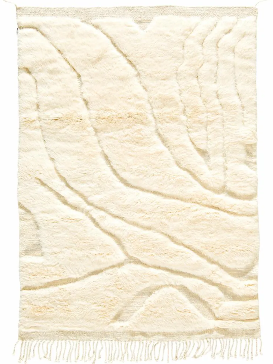 . Die Teppiche sind fast immer weißgrundig und zeichnen sich durch schwarze Zickzack-, Gitter- oder Rauten-Muster sowie einem wohnlich-zotteligen Flor aus. Kaum eine andere Teppichprovenienz passt mit ihren ursprünglichen nomadischen Designs besser in einen minimalistischen Wohnstil. Wie viele andere Nomadenteppiche auch, wurden dieBeni Ourain