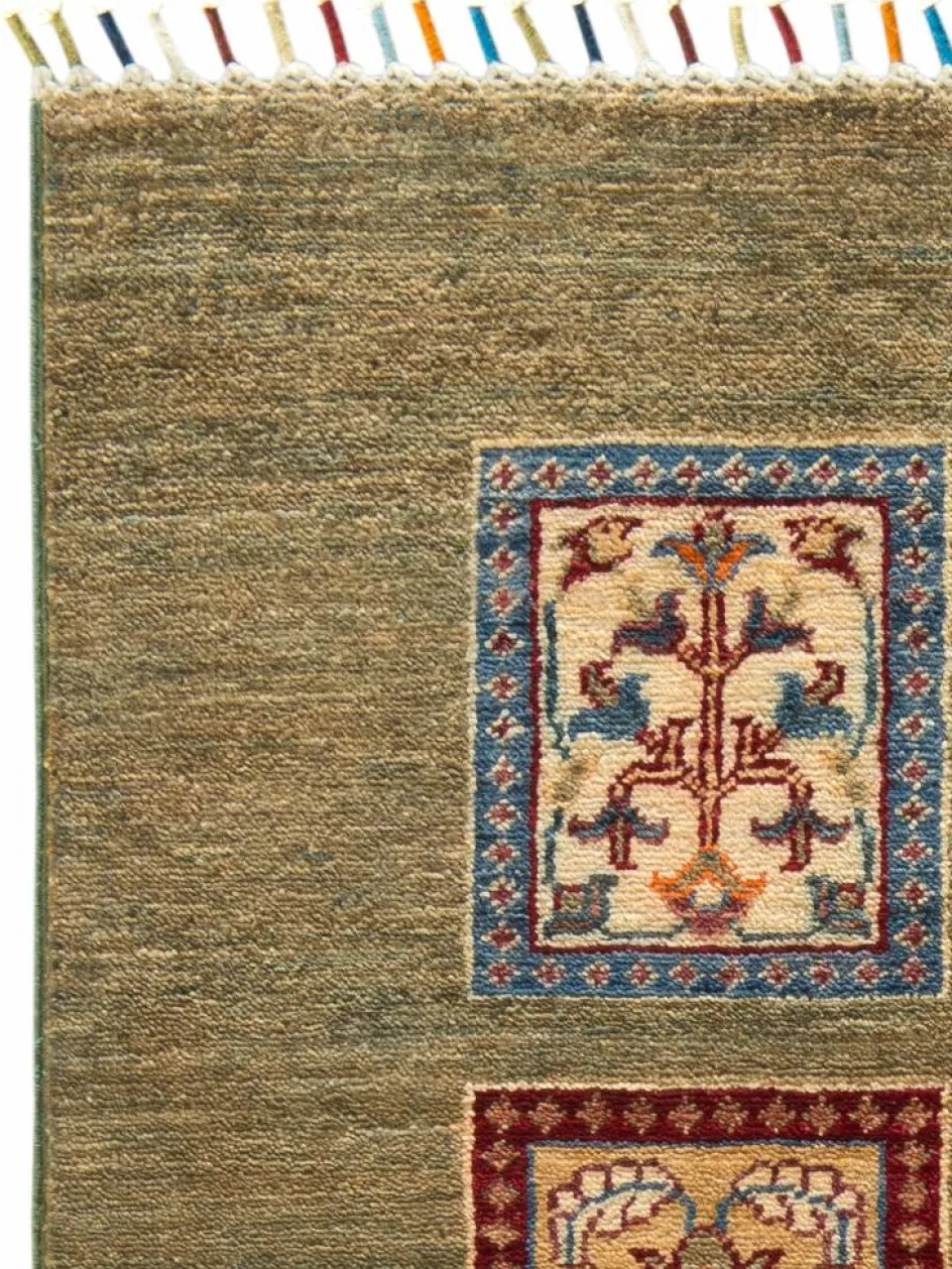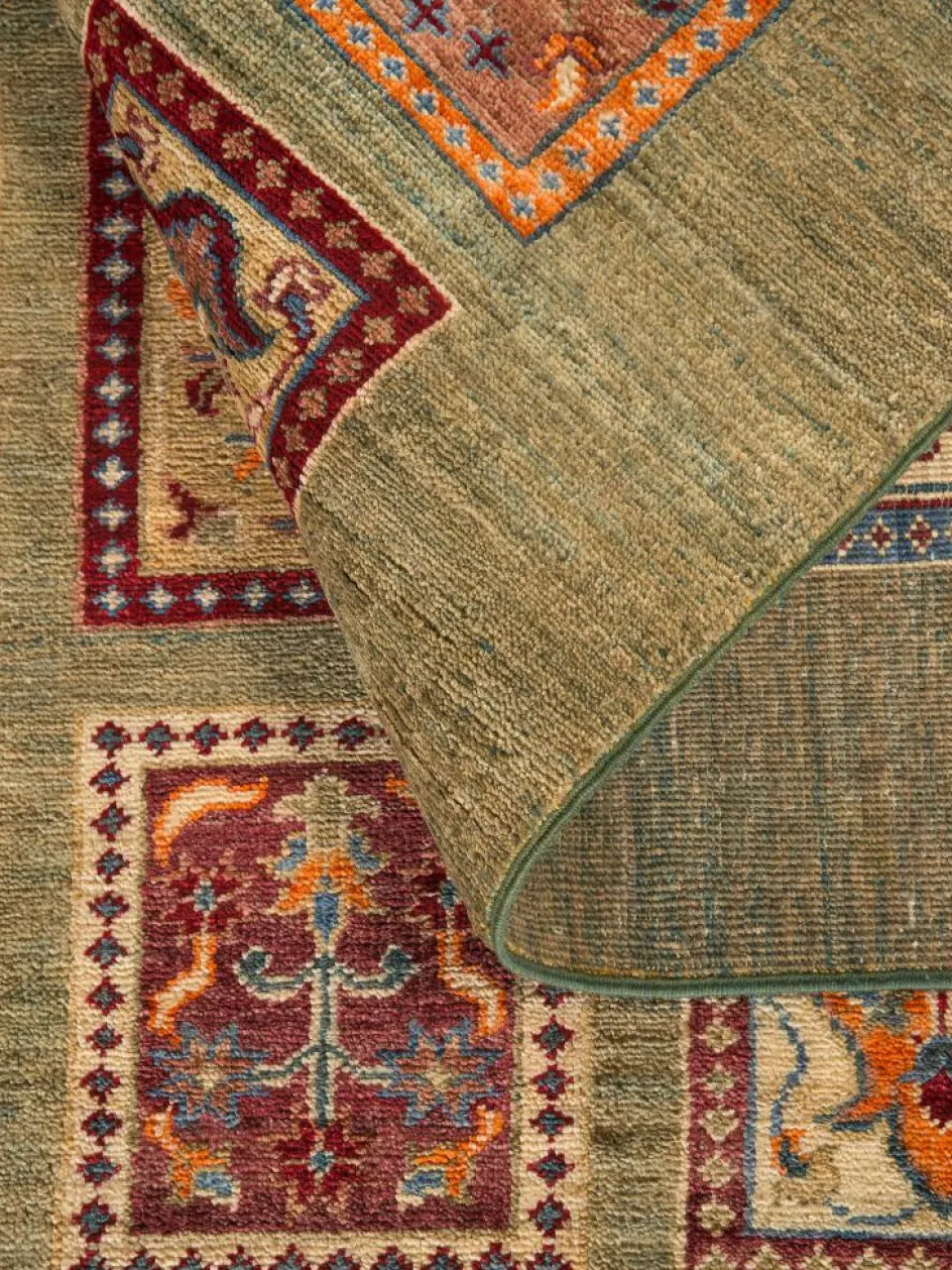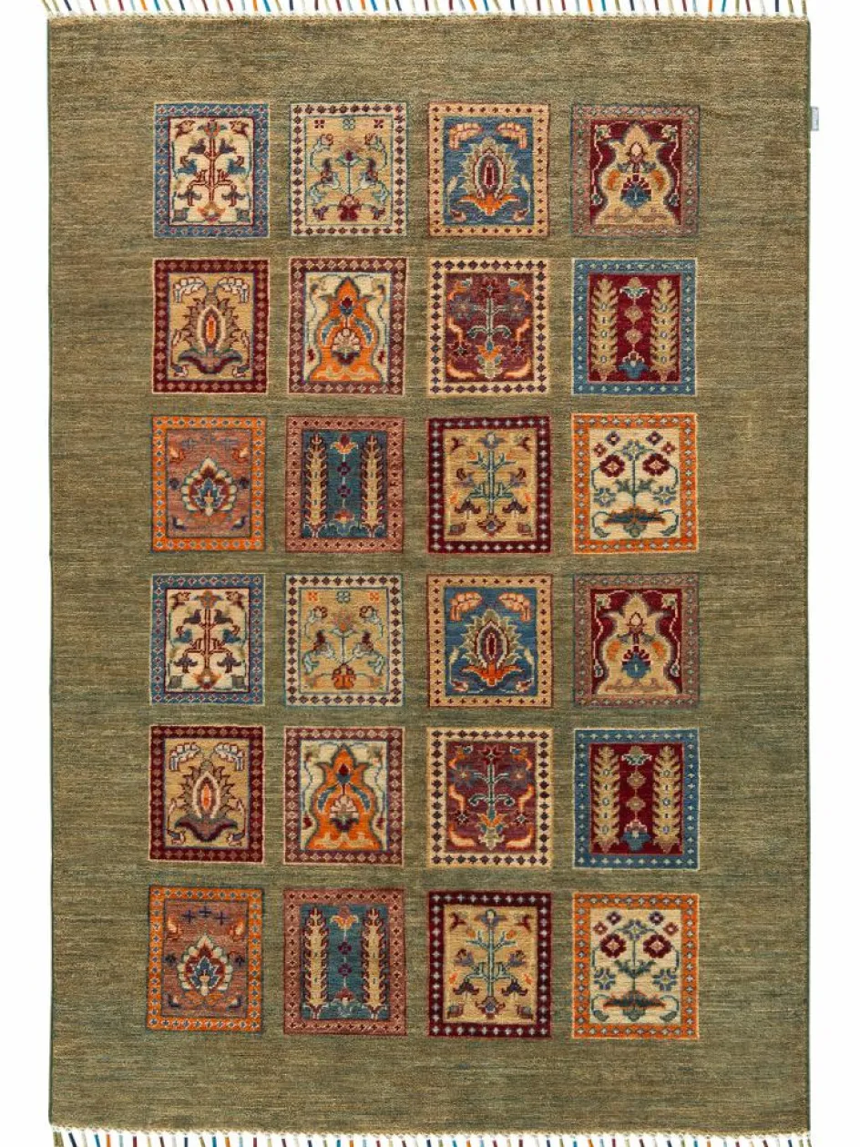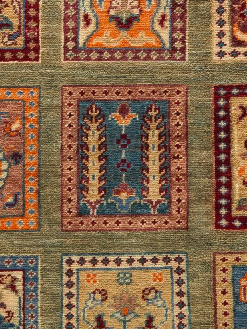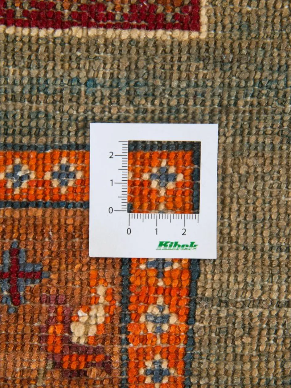 erinnert an einen üppig bewachsenen Garten mit geometrisch gegliederten, einzeln eingefassten Beeten zwischen denen die Bewässerungsgräben verlaufen. Durch den flachen und festen Flor ist der Teppich unempfindlich gegenüber den Belastungen des Alltags.- Das Besondere an diesemOrientteppich