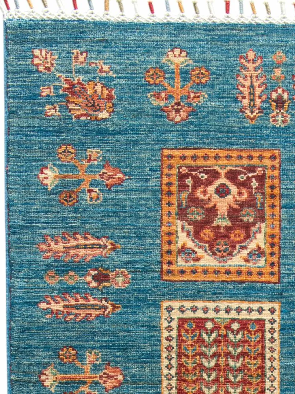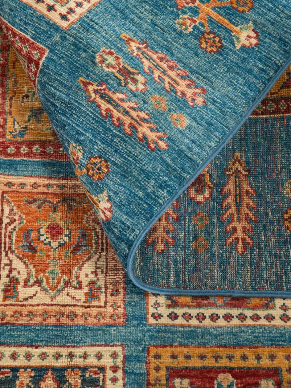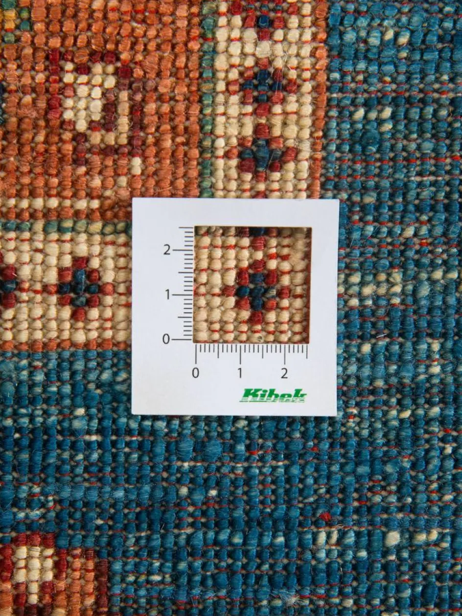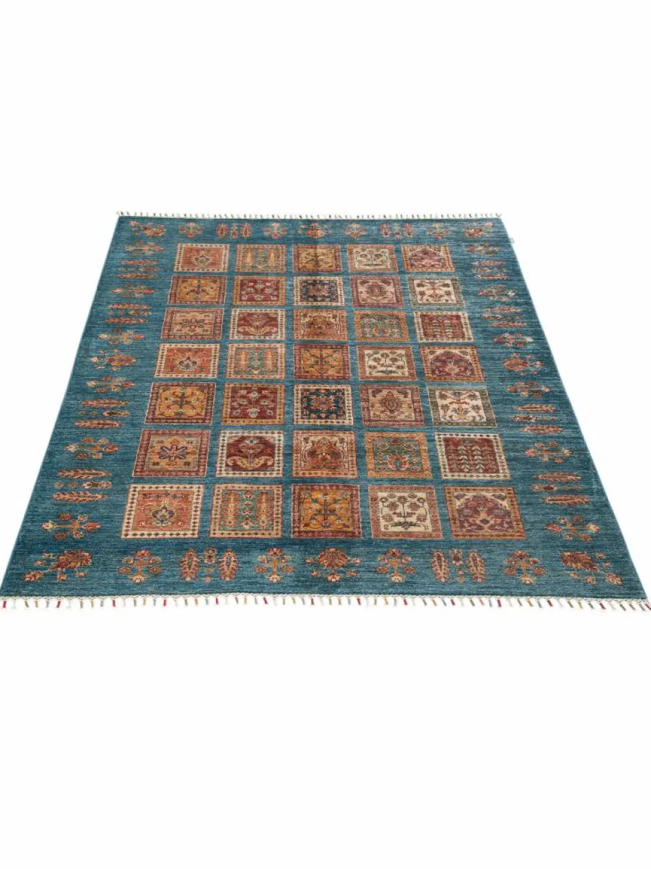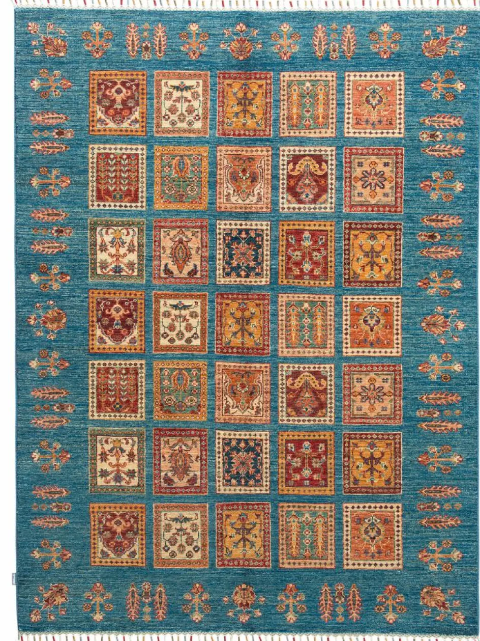 erinnert an einen üppig bewachsenen Garten mit geometrisch gegliederten, einzeln eingefassten Beeten zwischen denen die Bewässerungsgräben verlaufen. Durch den flachen und festen Flor ist der Teppich unempfindlich gegenüber den Belastungen des Alltags.- Das Besondere an diesemOrientteppich