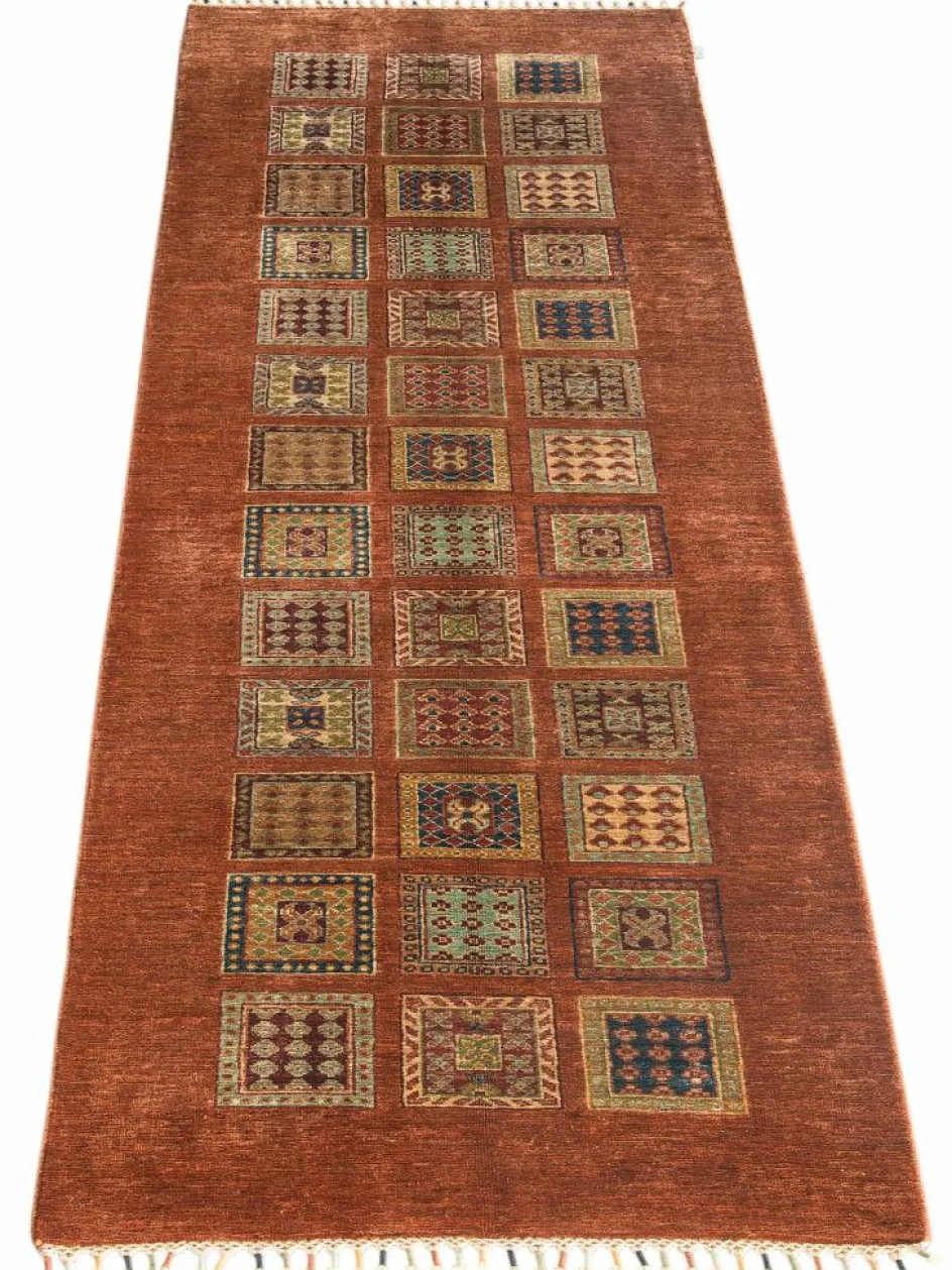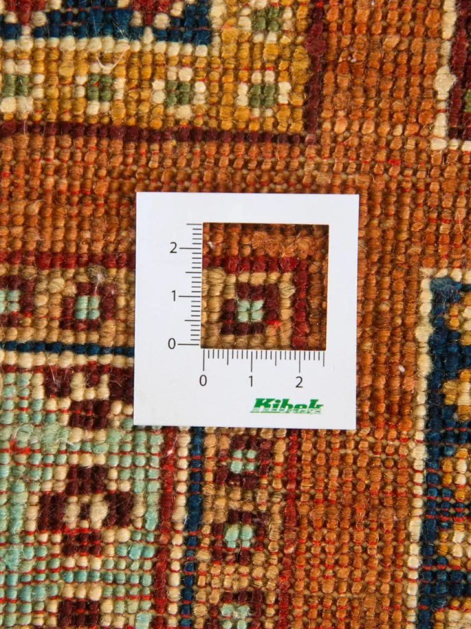 erinnert an einen üppig bewachsenen Garten mit geometrisch gegliederten, einzeln eingefassten Beeten zwischen denen die Bewässerungsgräben verlaufen. Durch den flachen und festen Flor ist der Teppich unempfindlich gegenüber den Belastungen des Alltags.- Das Besondere an diesemOrientteppich