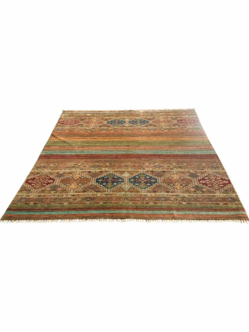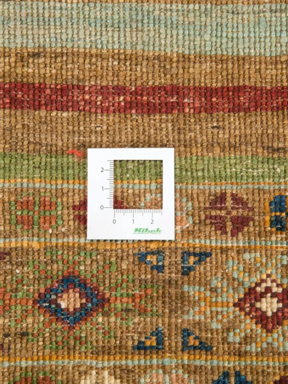 -Muster sind bunte Längsstreifen mit vielen verschiedenen Motiven gefüllt. Durch den flachen und festen Flor ist der Teppich unempfindlich gegenüber den Belastungen des Alltags.- Das Besondere an diesemOrientteppich
