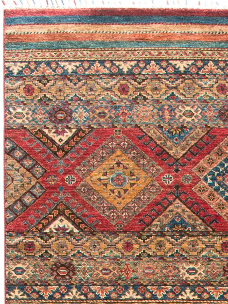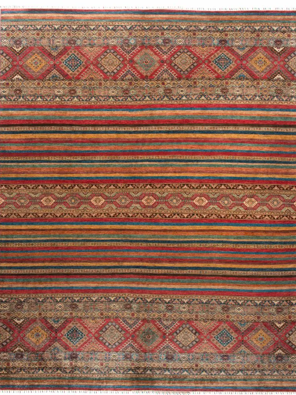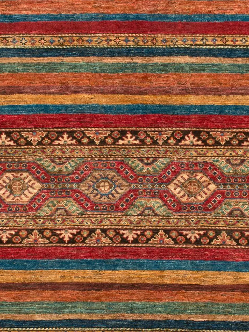 -Muster sind bunte Längsstreifen mit vielen verschiedenen Motiven gefüllt. Durch den flachen und festen Flor ist der Teppich unempfindlich gegenüber den Belastungen des Alltags.- Das Besondere an diesemOrientteppich