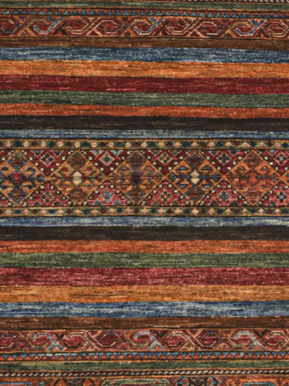 -Muster sind bunte Längsstreifen mit vielen verschiedenen Motiven gefüllt. Durch den flachen und festen Flor ist der Teppich unempfindlich gegenüber den Belastungen des Alltags. – Das Besondere an diesemOrientteppich