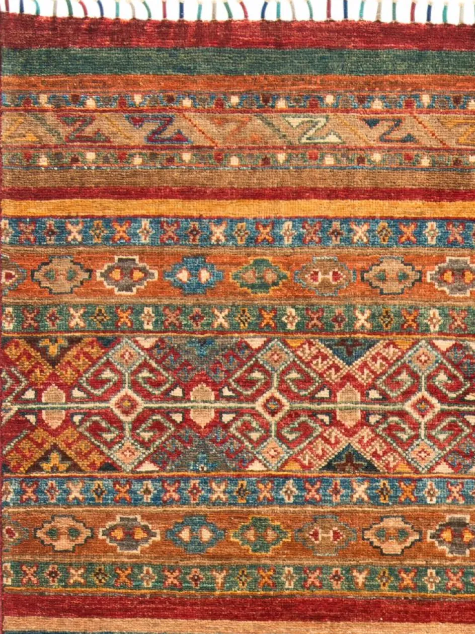 -Muster sind bunte Längsstreifen mit vielen verschiedenen Motiven gefüllt. Durch den flachen und festen Flor ist der Teppich unempfindlich gegenüber den Belastungen des Alltags.- Das Besondere an diesemOrientteppich