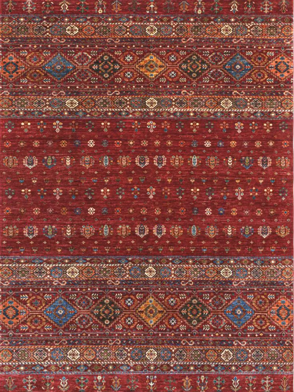 -Muster sind bunte Längsstreifen mit vielen verschiedenen Motiven gefüllt. Durch den flachen und festen Flor ist der Teppich unempfindlich gegenüber den Belastungen des Alltags. – Das Besondere an diesemOrientteppich