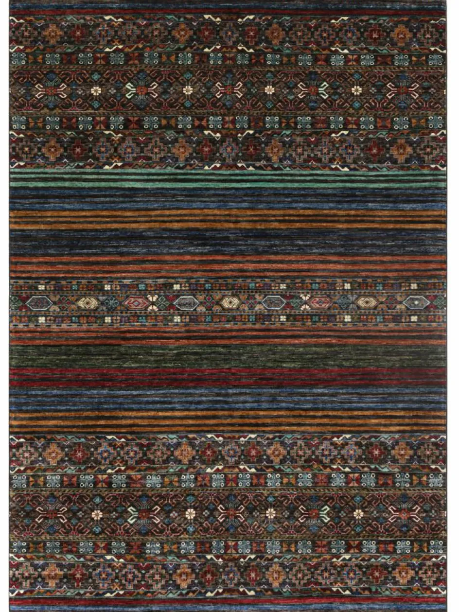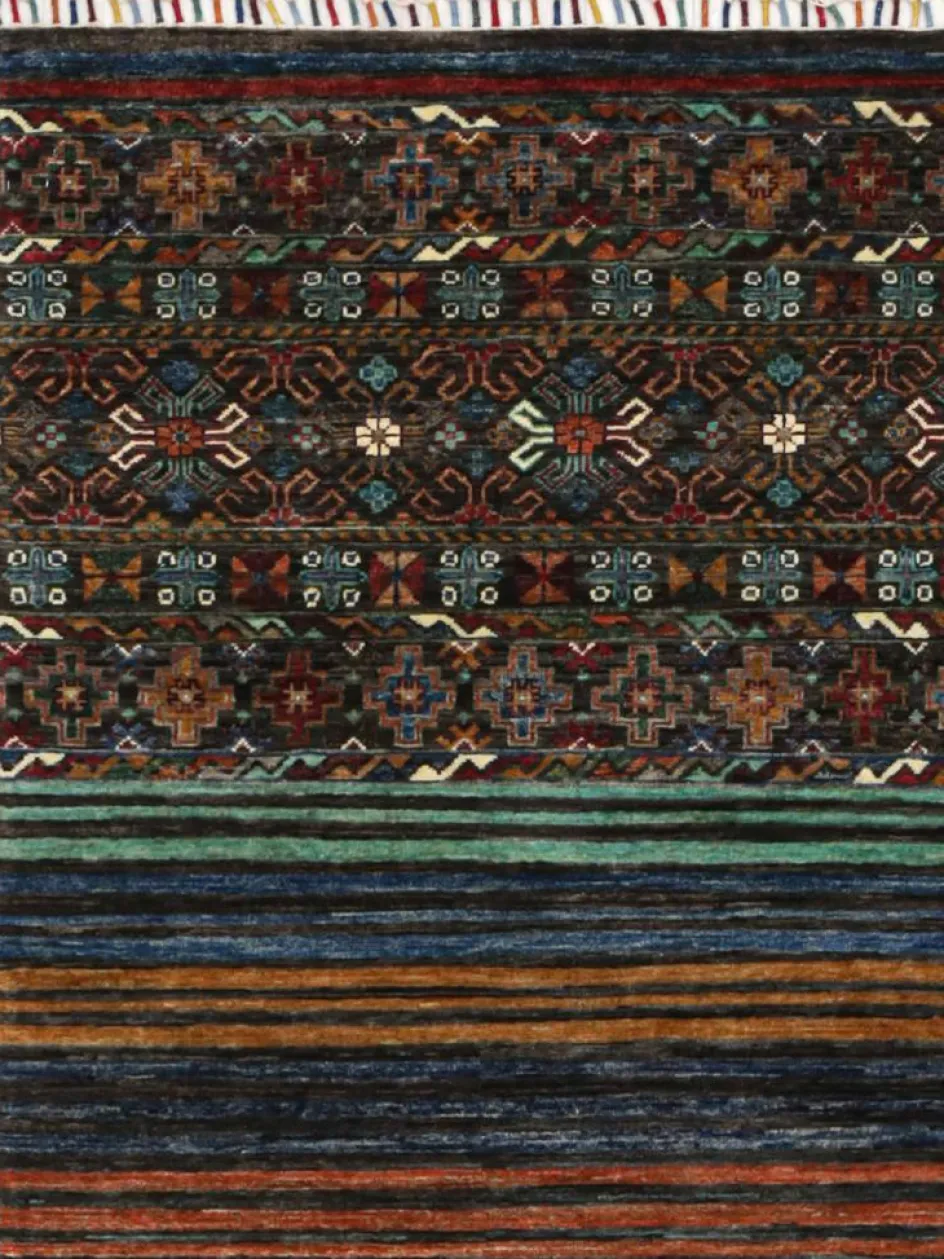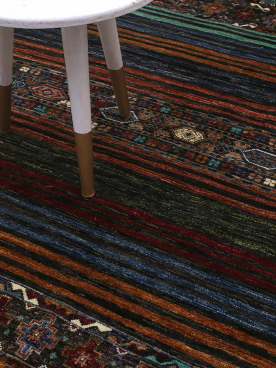 -Muster sind bunte Längsstreifen mit vielen verschiedenen Motiven gefüllt. Durch den flachen und festen Flor ist der Teppich unempfindlich gegenüber den Belastungen des Alltags. – Das Besondere an diesemOrientteppich