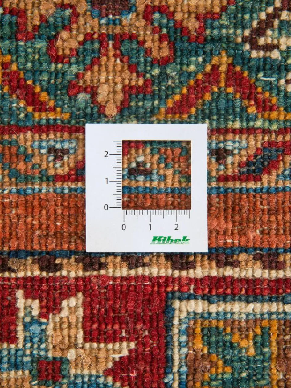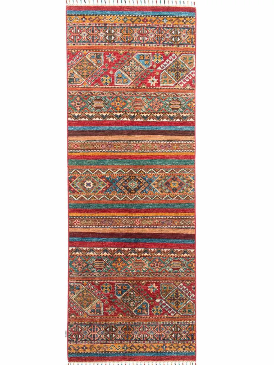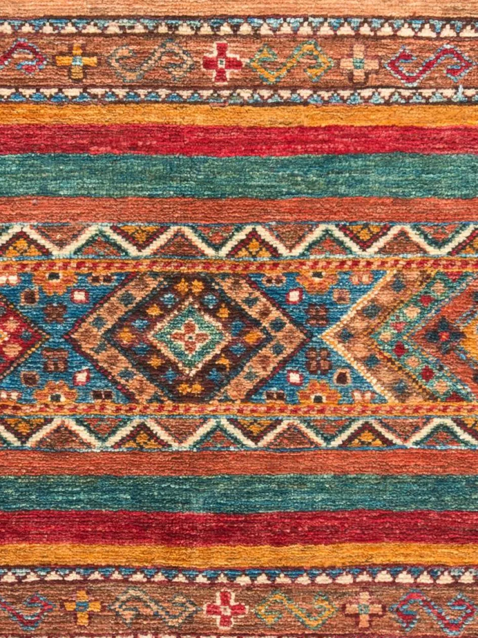 -Muster sind bunte Längsstreifen mit vielen verschiedenen Motiven gefüllt. Durch den flachen und festen Flor ist der Teppich unempfindlich gegenüber den Belastungen des Alltags.- Das Besondere an diesemOrientteppich