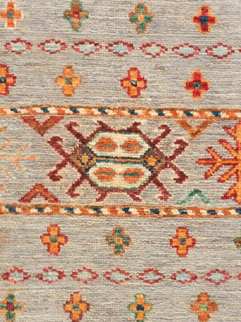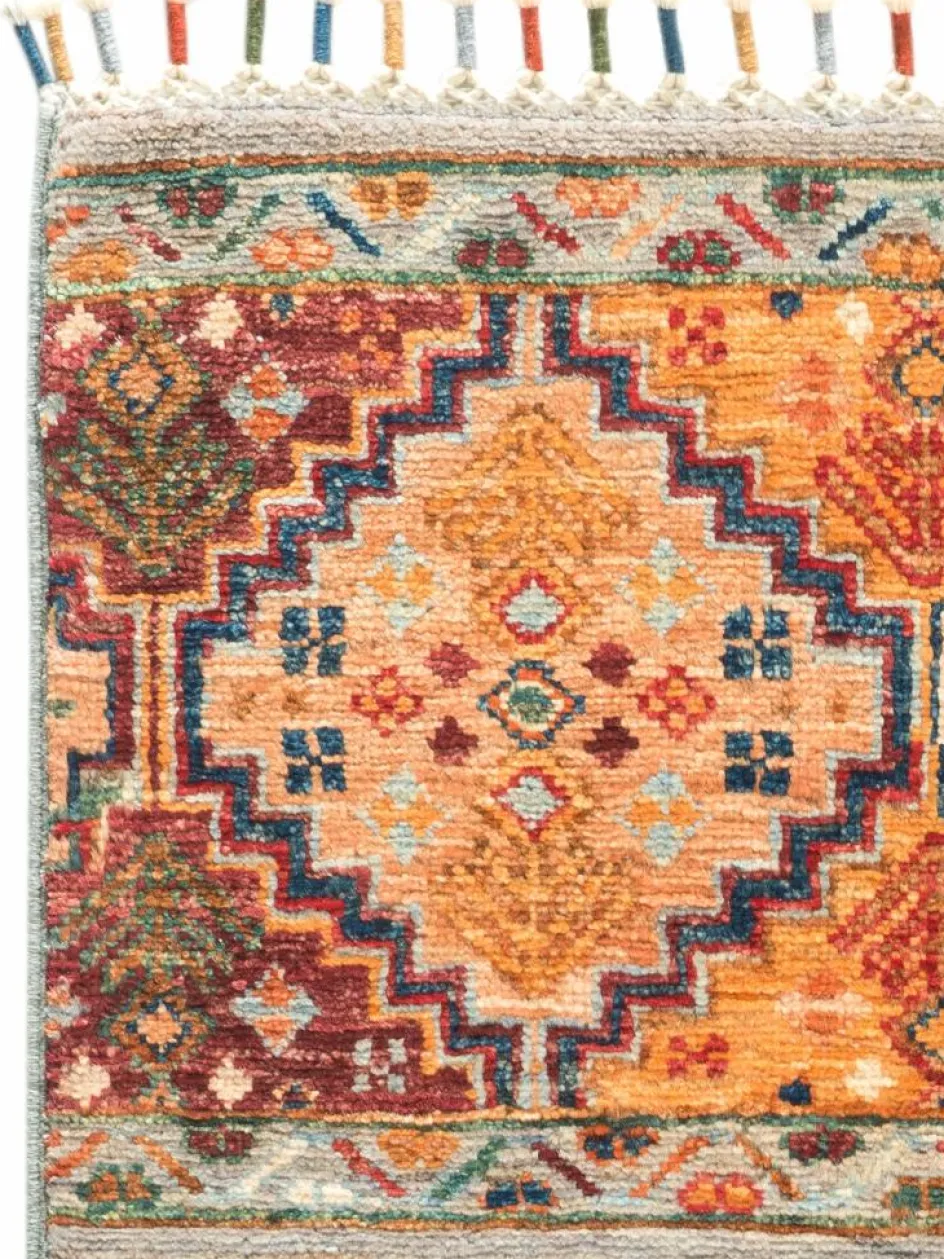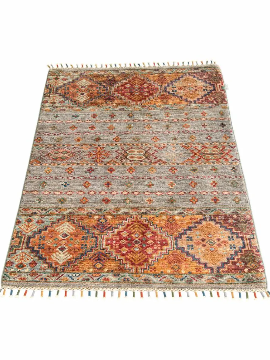 -Muster sind bunte Längsstreifen mit vielen verschiedenen Motiven gefüllt. Durch den flachen und festen Flor ist der Teppich unempfindlich gegenüber den Belastungen des Alltags.- Das Besondere an diesemOrientteppich