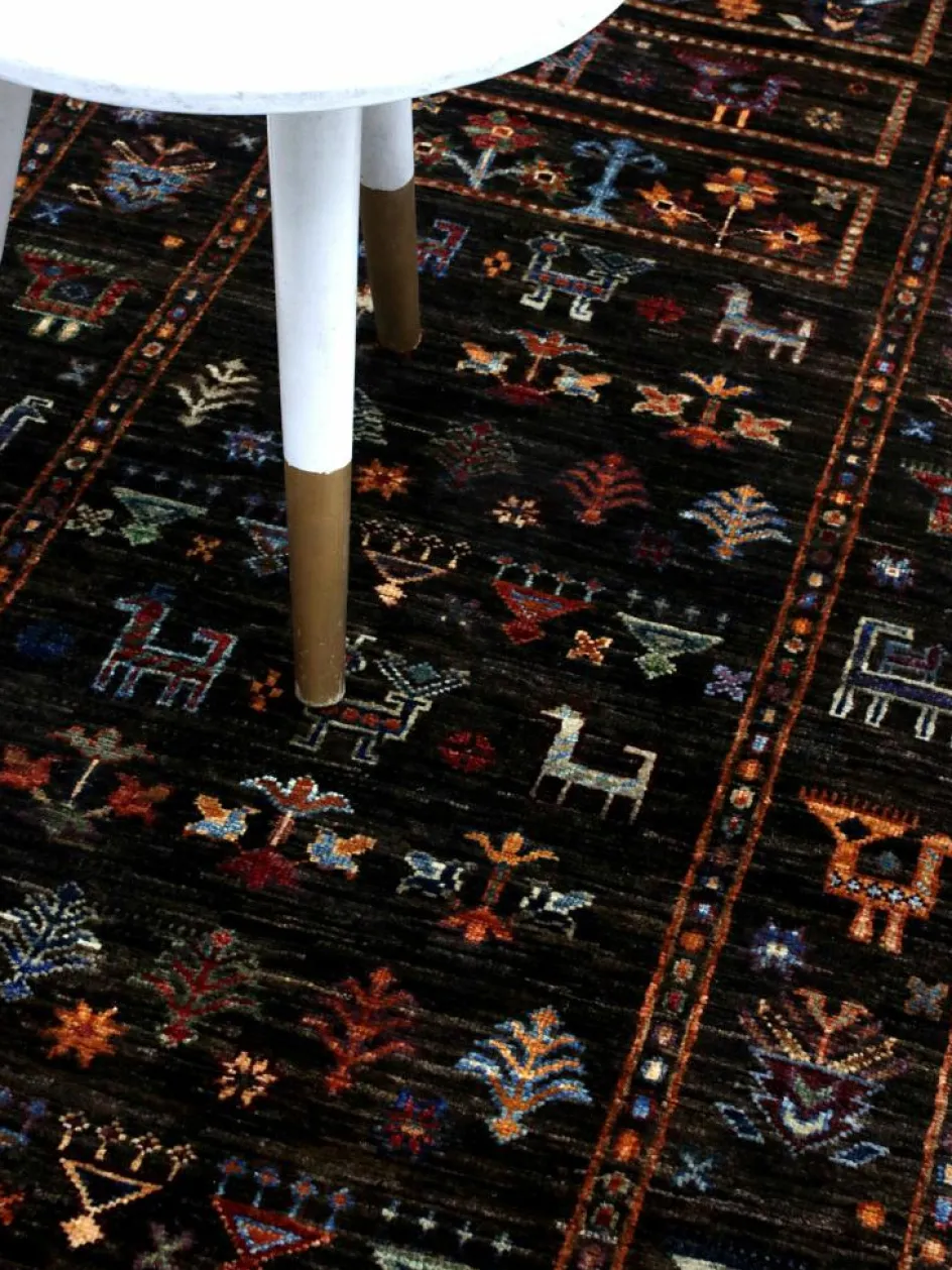 -Muster sind bunte Längsstreifen mit vielen verschiedenen Motiven gefüllt. Durch den flachen und festen Flor ist der Teppich unempfindlich gegenüber den Belastungen des Alltags. – Das Besondere an diesemOrientteppich