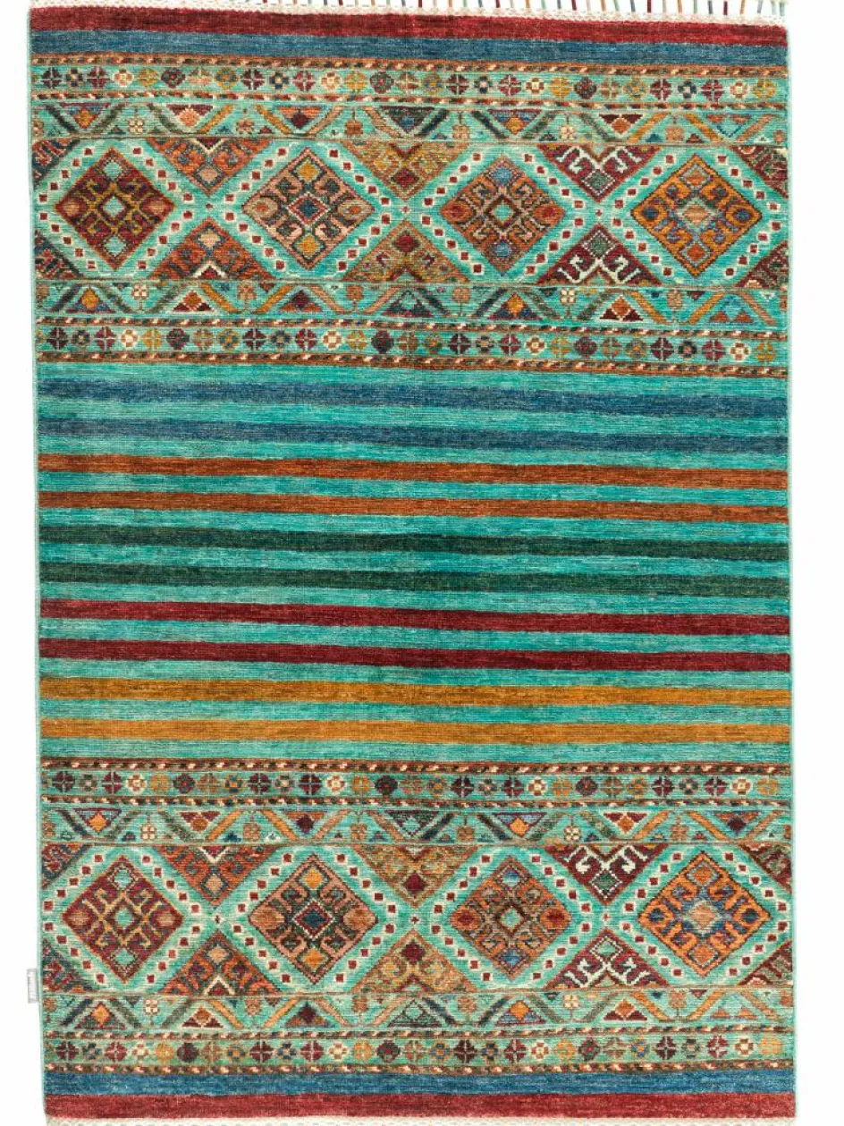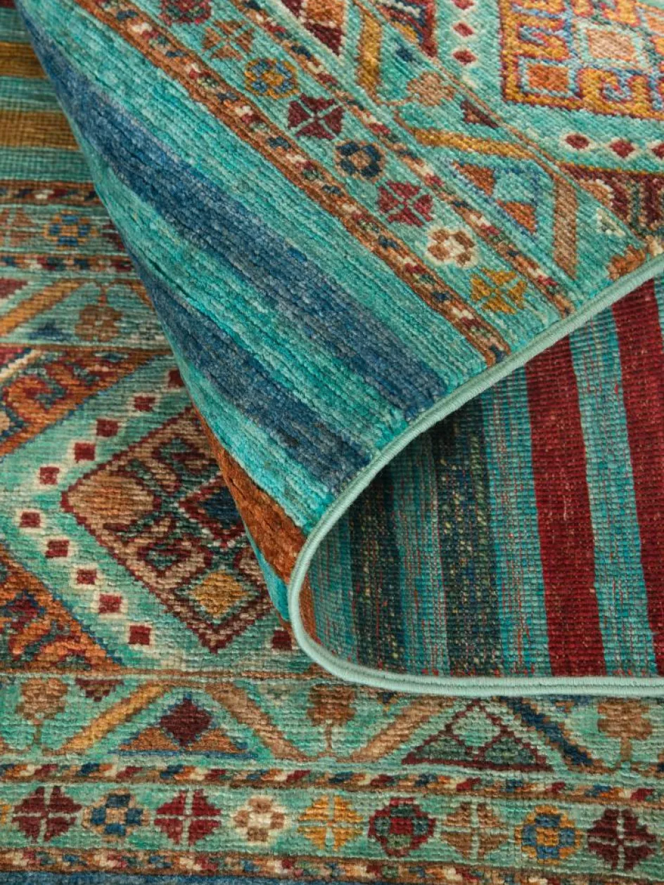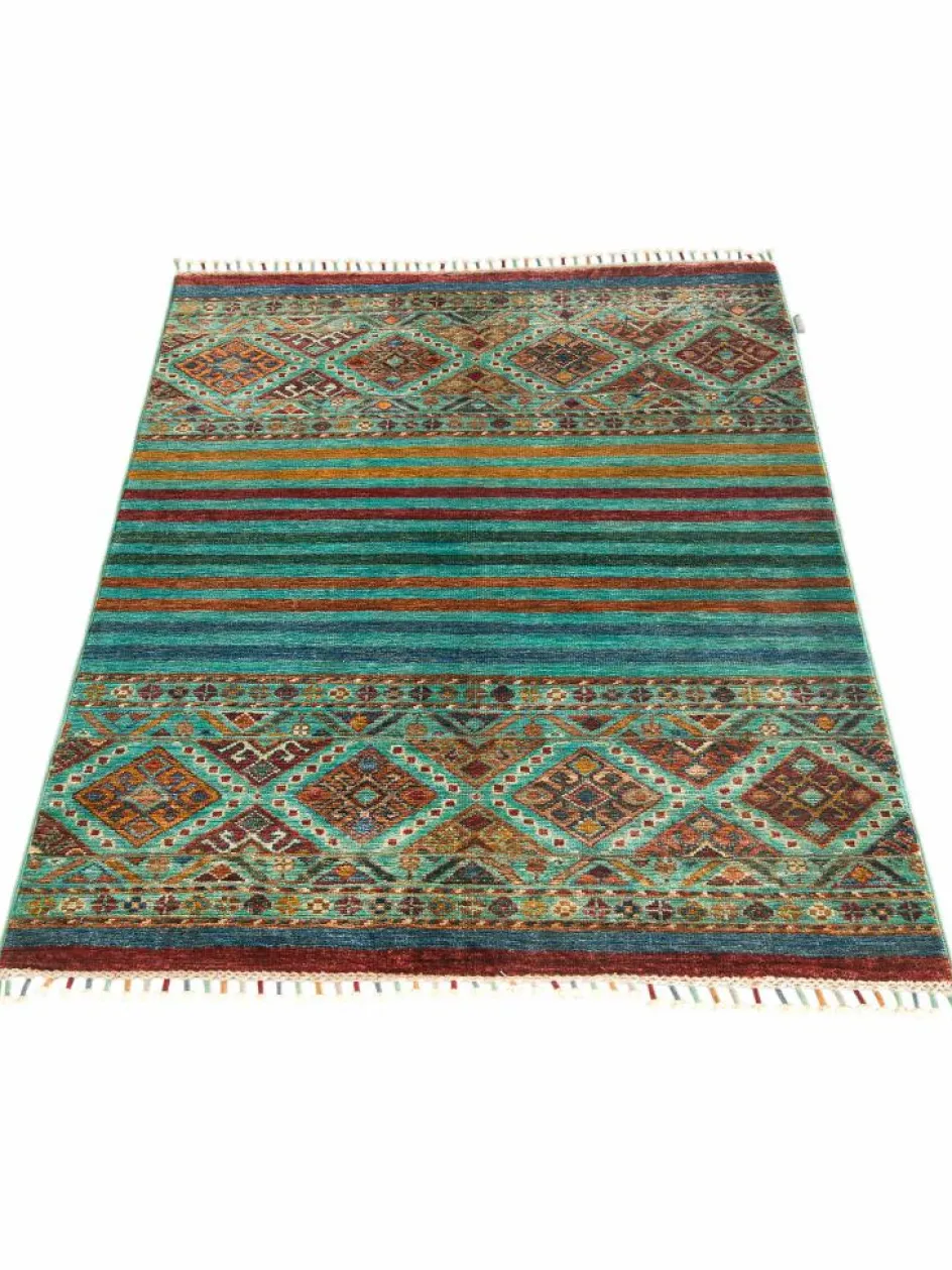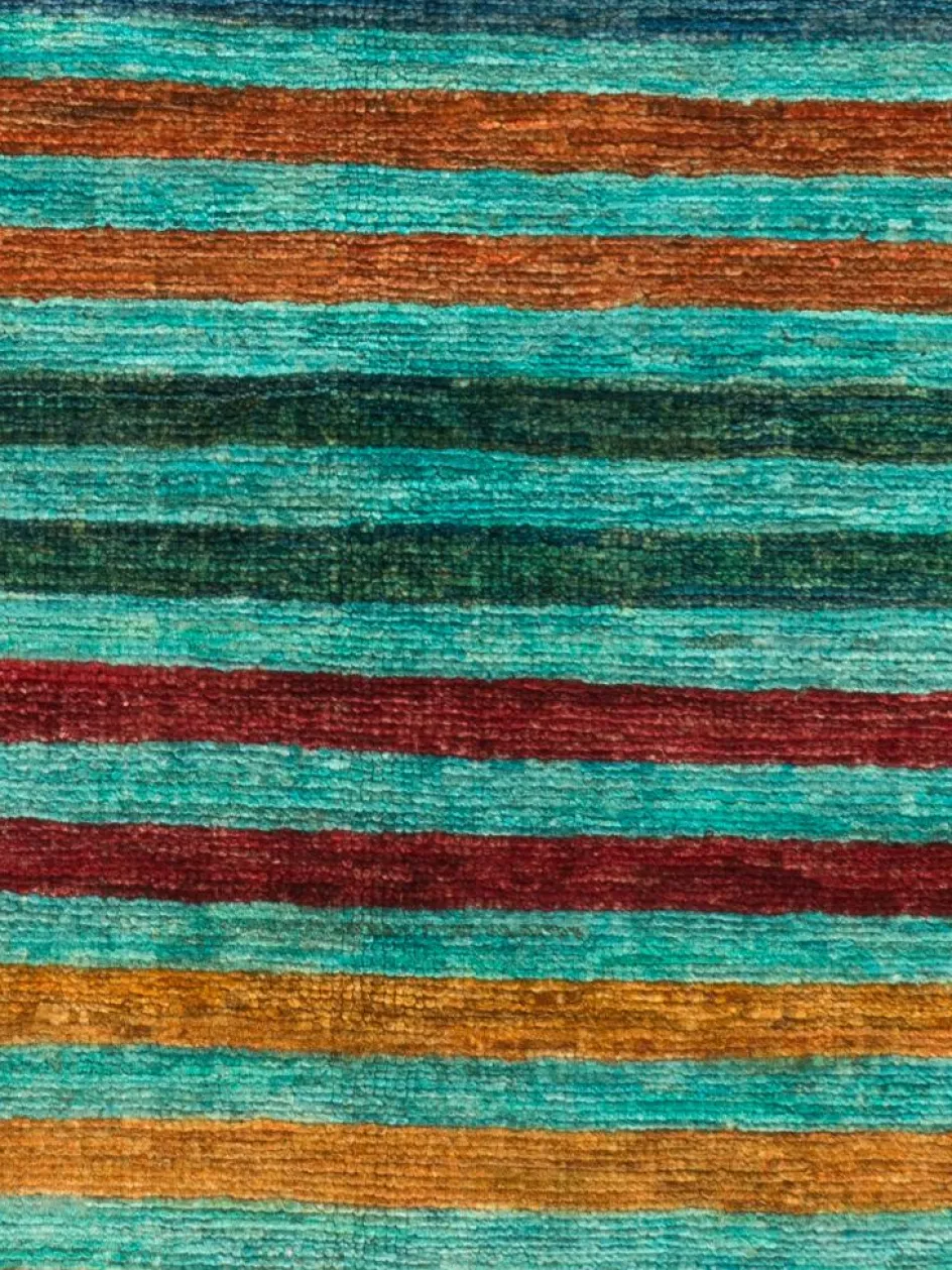 -Muster sind bunte Längsstreifen mit vielen verschiedenen Motiven gefüllt. Durch den flachen und festen Flor ist der Teppich unempfindlich gegenüber den Belastungen des Alltags.- Das Besondere an diesemOrientteppich