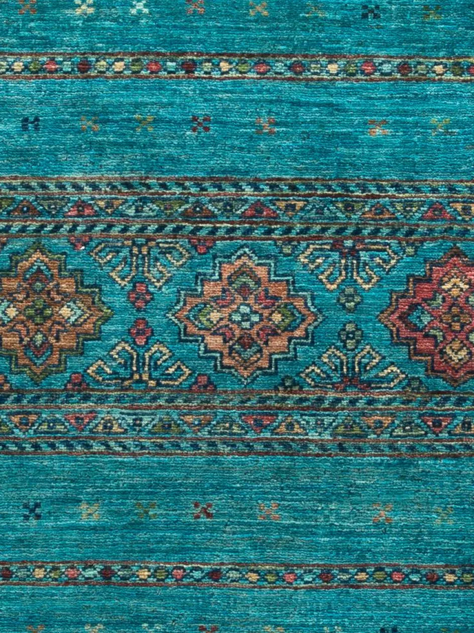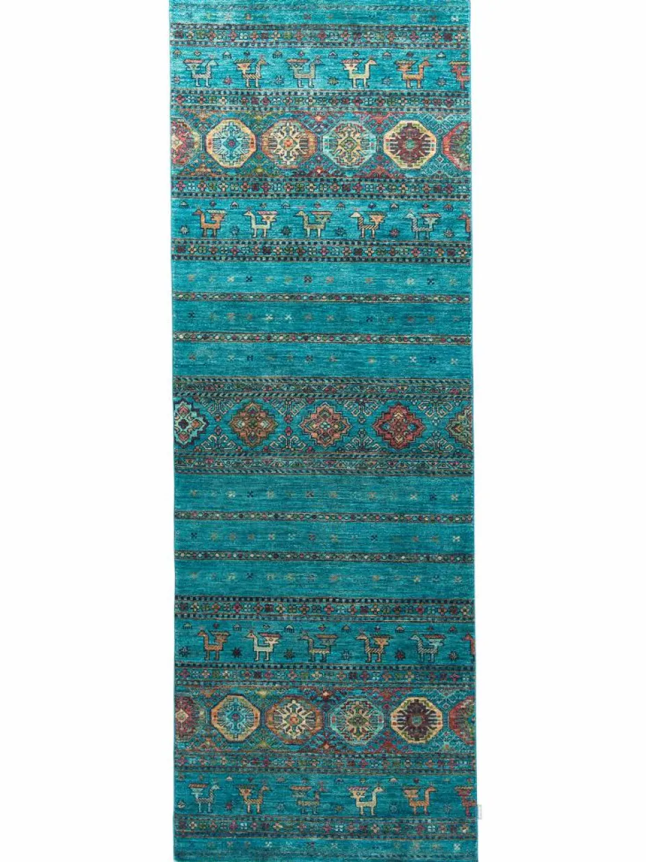 -Muster sind bunte Längsstreifen mit vielen verschiedenen Motiven gefüllt. Durch den flachen und festen Flor ist der Teppich unempfindlich gegenüber den Belastungen des Alltags.- Das Besondere an diesemOrientteppich