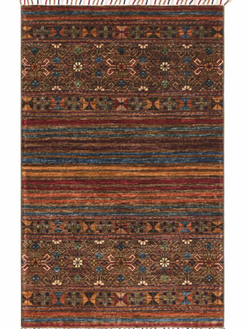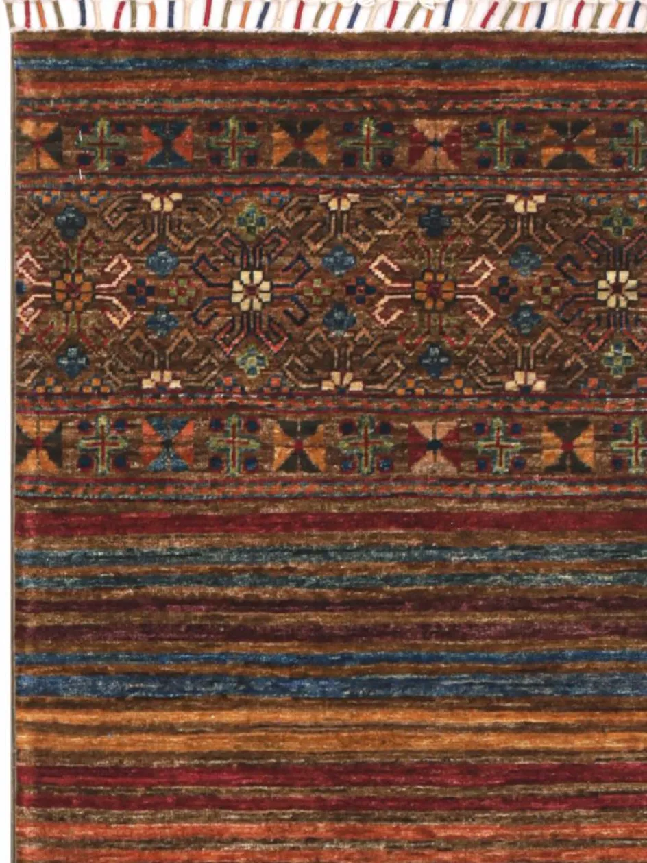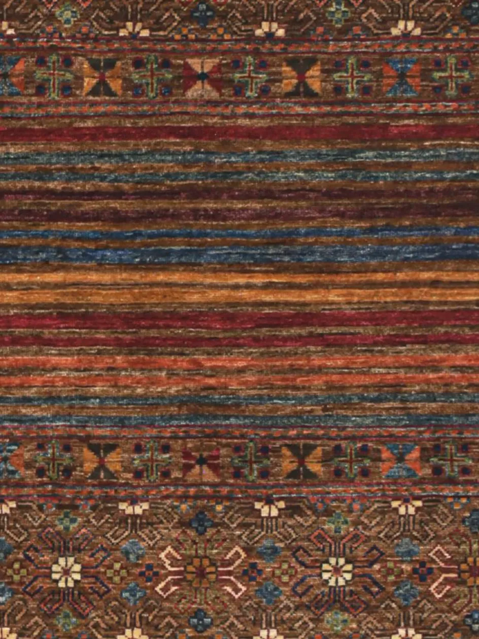 -Muster sind bunte Längsstreifen mit vielen verschiedenen Motiven gefüllt. Durch den flachen und festen Flor ist der Teppich unempfindlich gegenüber den Belastungen des Alltags. – Das Besondere an diesemOrientteppich