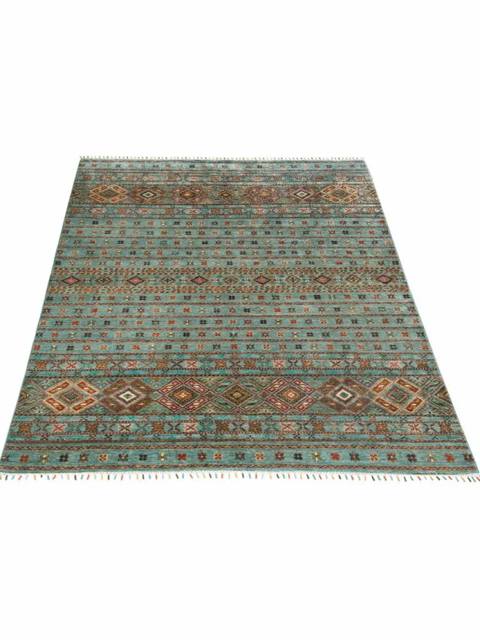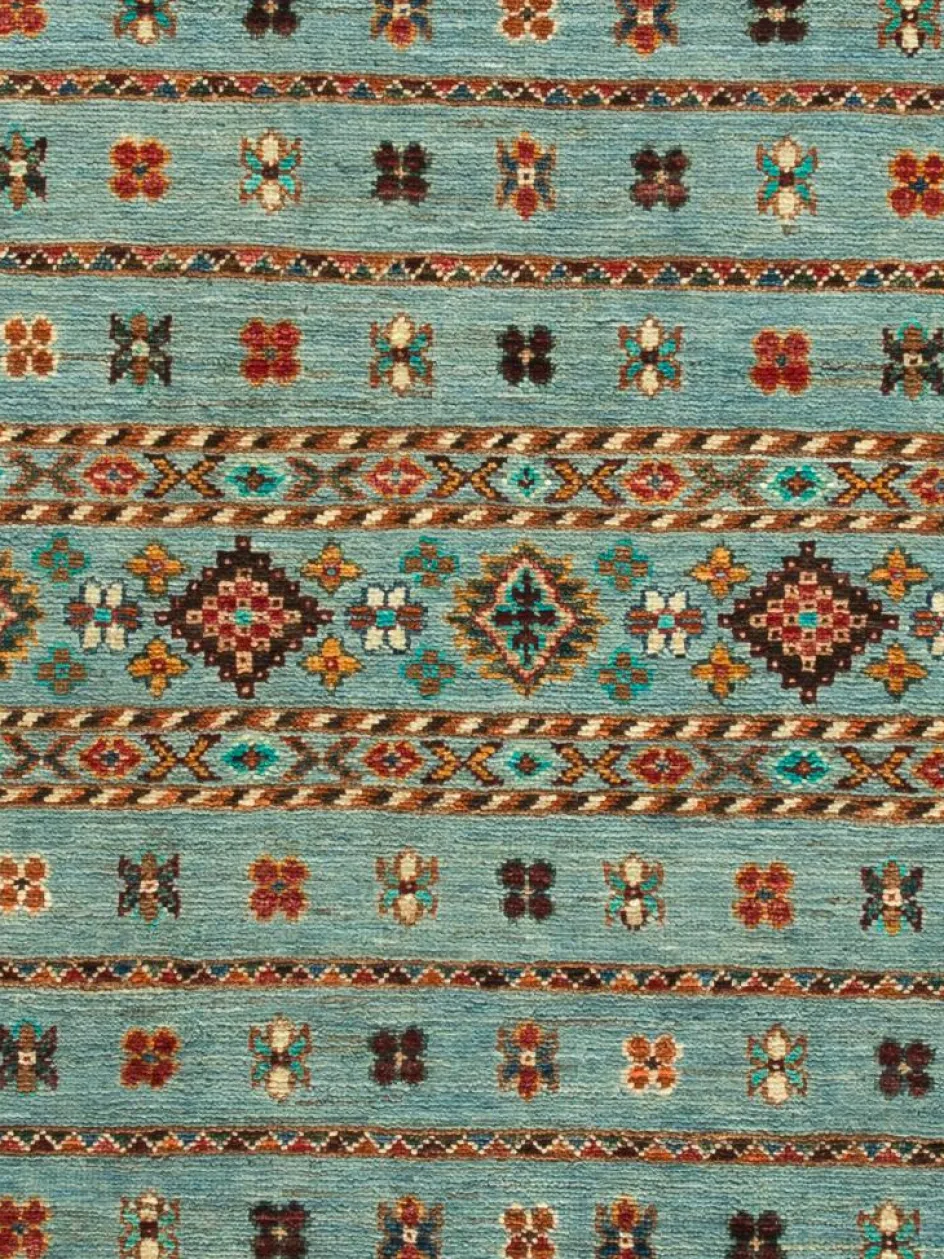 -Muster sind bunte Längsstreifen mit vielen verschiedenen Motiven gefüllt. Durch den flachen und festen Flor ist der Teppich unempfindlich gegenüber den Belastungen des Alltags.- Das Besondere an diesemOrientteppich