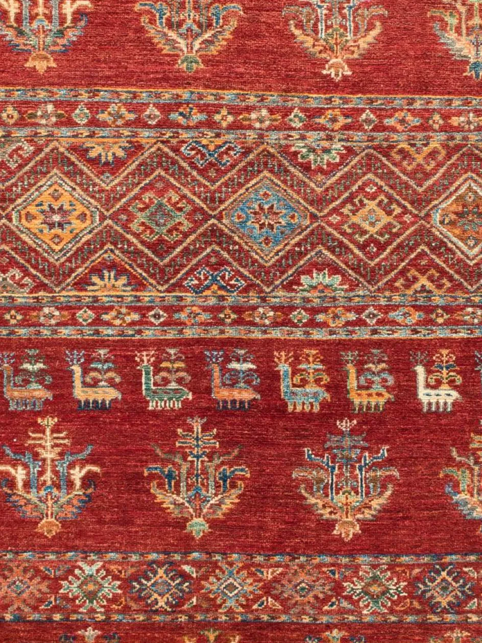 -Muster sind bunte Längsstreifen mit vielen verschiedenen Motiven gefüllt. Durch den flachen und festen Flor ist der Teppich unempfindlich gegenüber den Belastungen des Alltags.- Das Besondere an diesemOrientteppich
