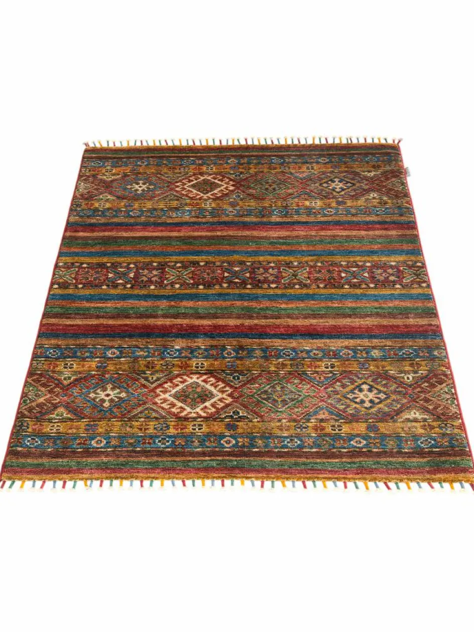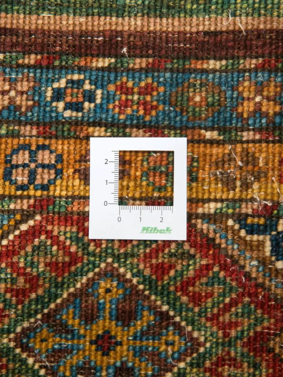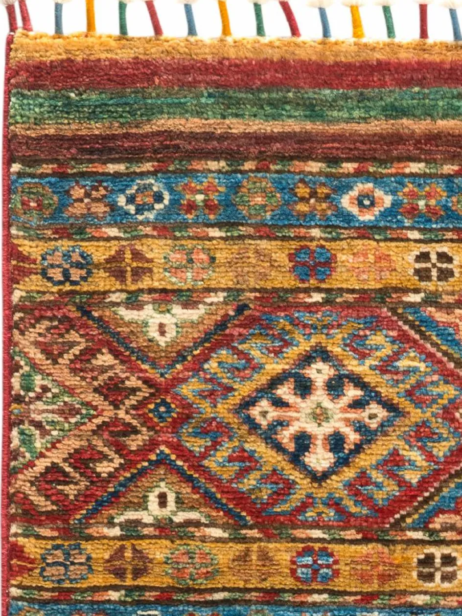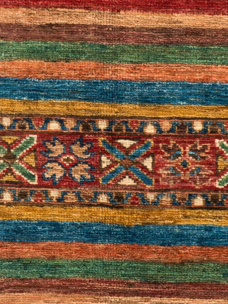 -Muster sind bunte Längsstreifen mit vielen verschiedenen Motiven gefüllt. Durch den flachen und festen Flor ist der Teppich unempfindlich gegenüber den Belastungen des Alltags.- Das Besondere an diesemOrientteppich