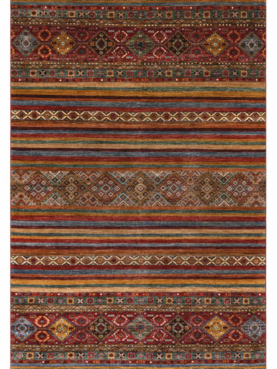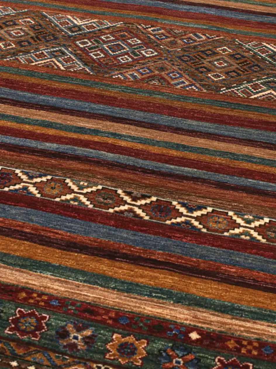 -Muster sind bunte Längsstreifen mit vielen verschiedenen Motiven gefüllt. Durch den flachen und festen Flor ist der Teppich unempfindlich gegenüber den Belastungen des Alltags. – Das Besondere an diesemOrientteppich