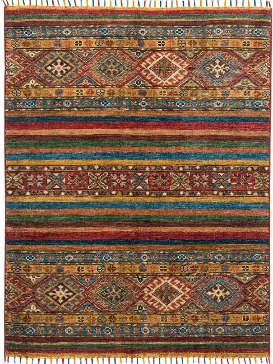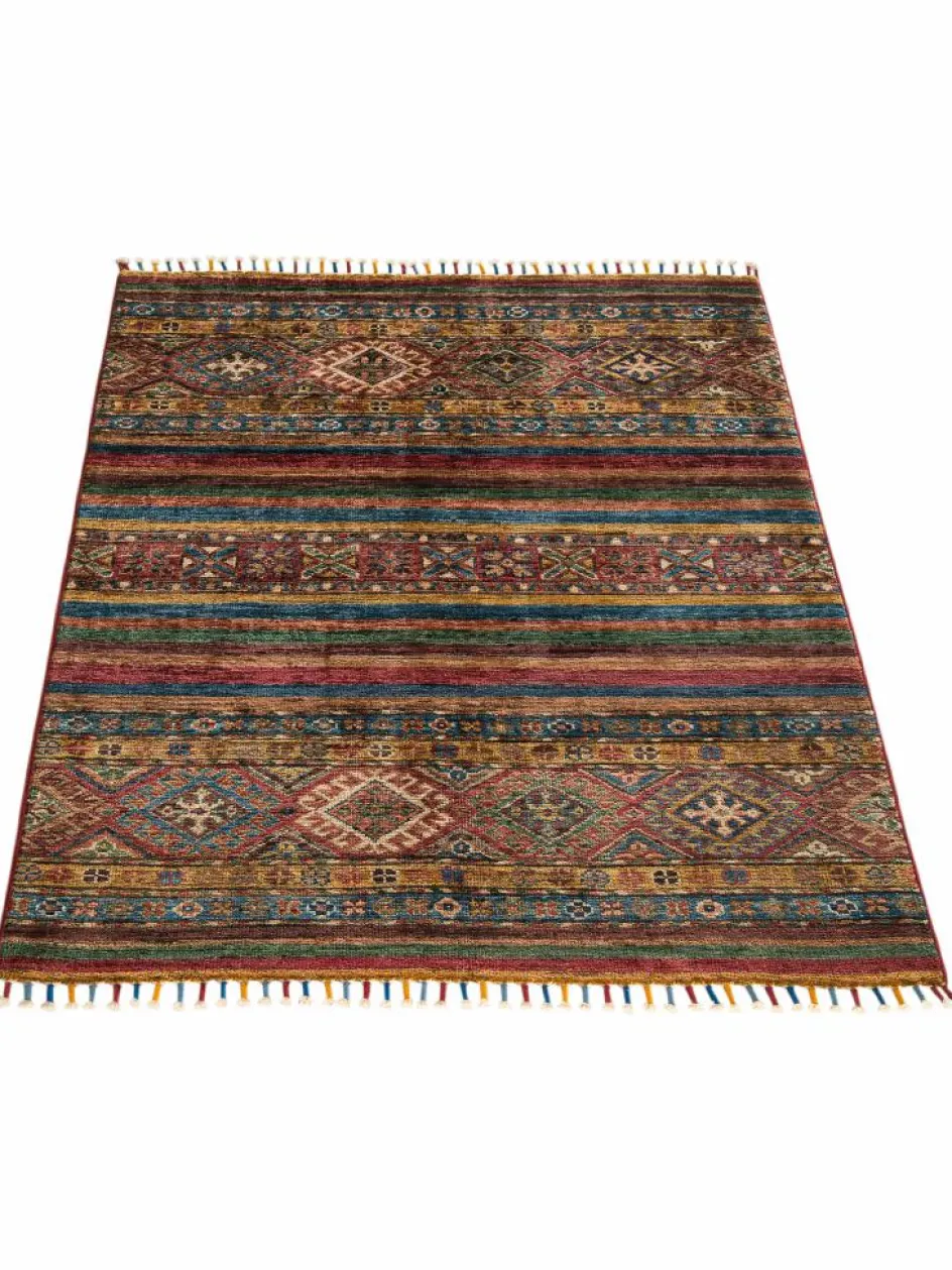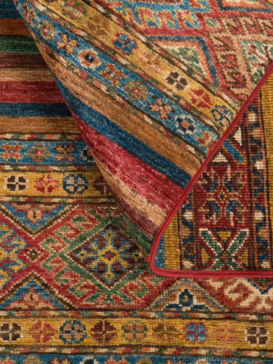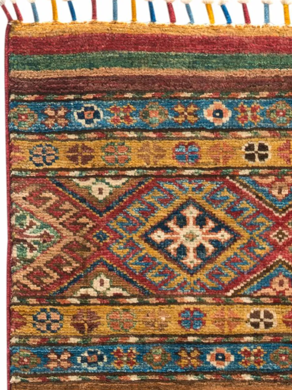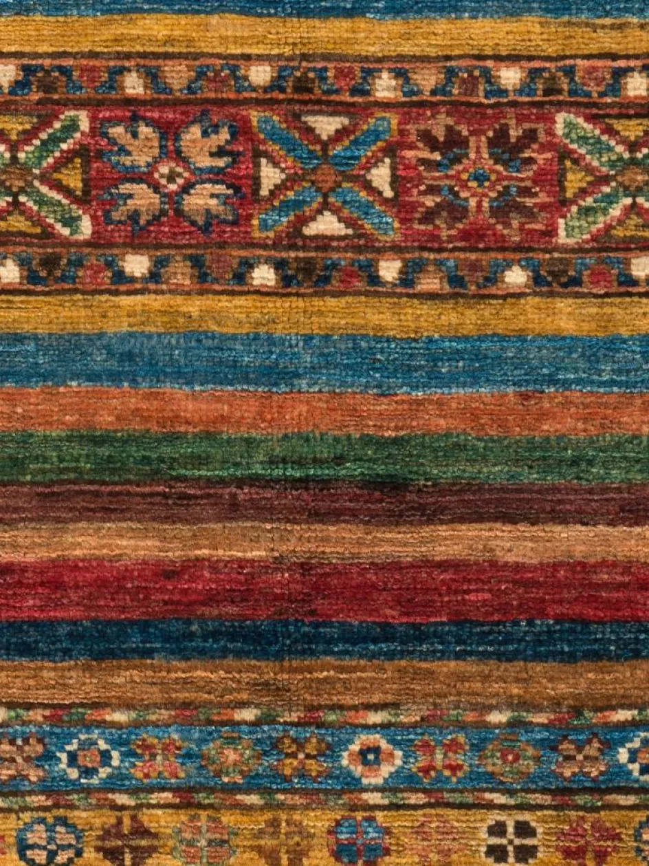 -Muster sind bunte Längsstreifen mit vielen verschiedenen Motiven gefüllt. Durch den flachen und festen Flor ist der Teppich unempfindlich gegenüber den Belastungen des Alltags.- Das Besondere an diesemOrientteppich
