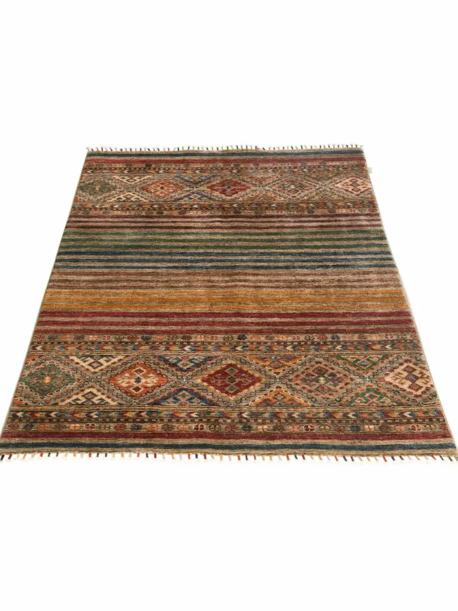 -Muster sind bunte Längsstreifen mit vielen verschiedenen Motiven gefüllt. Durch den flachen und festen Flor ist der Teppich unempfindlich gegenüber den Belastungen des Alltags.- Das Besondere an diesemOrientteppich