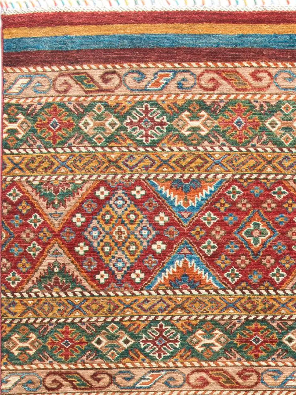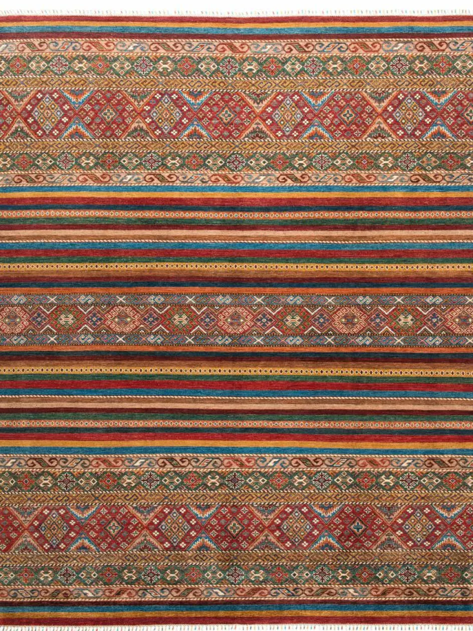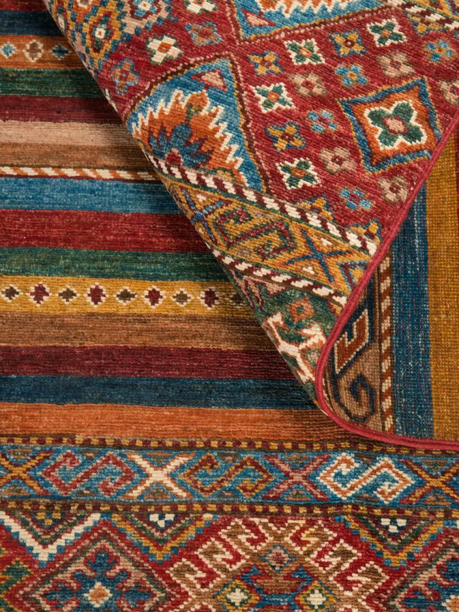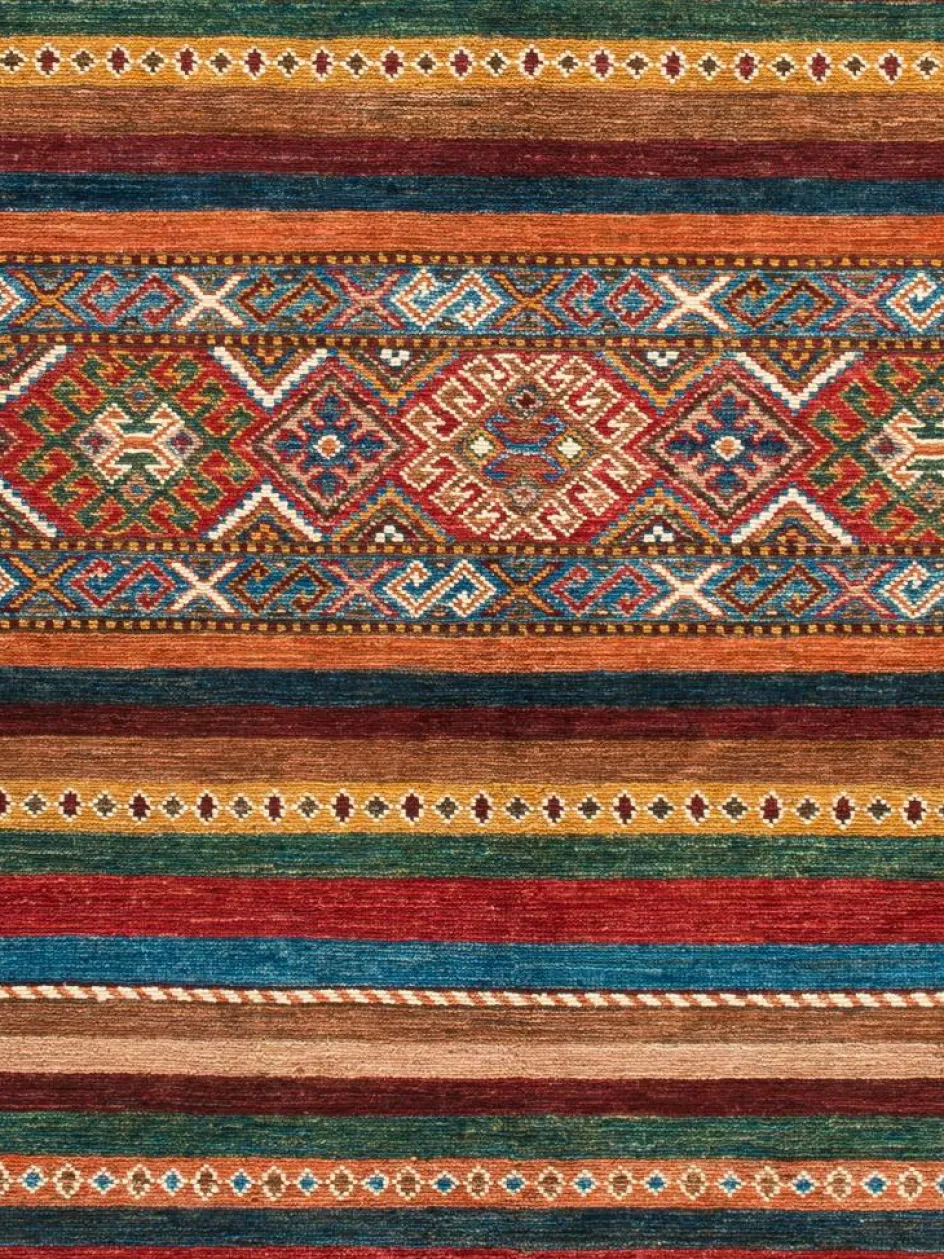 -Muster sind bunte Längsstreifen mit vielen verschiedenen Motiven gefüllt. Durch den flachen und festen Flor ist der Teppich unempfindlich gegenüber den Belastungen des Alltags.- Das Besondere an diesemOrientteppich