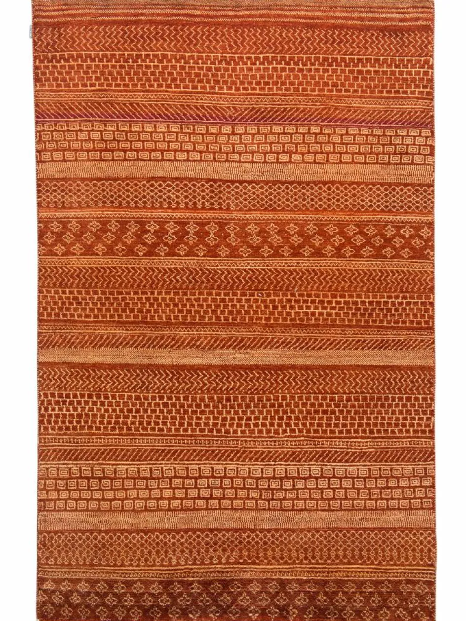 ist eine ungewöhnliche moderne Variation des traditionellen persichen Gabbehs. Er ist kürzer im Flor und feiner geknüpft. Es gibt zahllose Neukreationen in individuellen und einzigartigen Farben und Mustern.| Gesamthöhe: | ca. 6 mm |