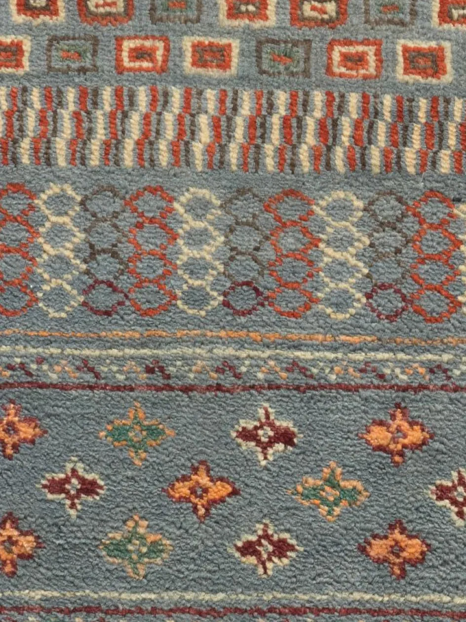 ist eine ungewöhnliche moderne Variation des traditionellen persichen Gabbehs. Er ist kürzer im Flor und feiner geknüpft. Es gibt zahllose Neukreationen in individuellen und einzigartigen Farben und Mustern.| Gesamthöhe: | ca. 10 mm |