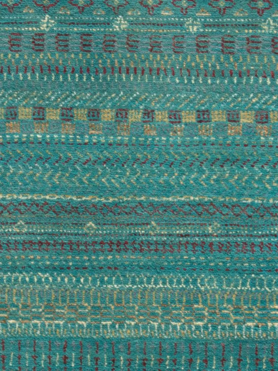 ist eine ungewöhnliche moderne Variation des traditionellen persichen Gabbehs. Er ist kürzer im Flor und feiner geknüpft. Es gibt zahllose Neukreationen in individuellen und einzigartigen Farben und Mustern.| Gesamthöhe: | ca. 10 mm |