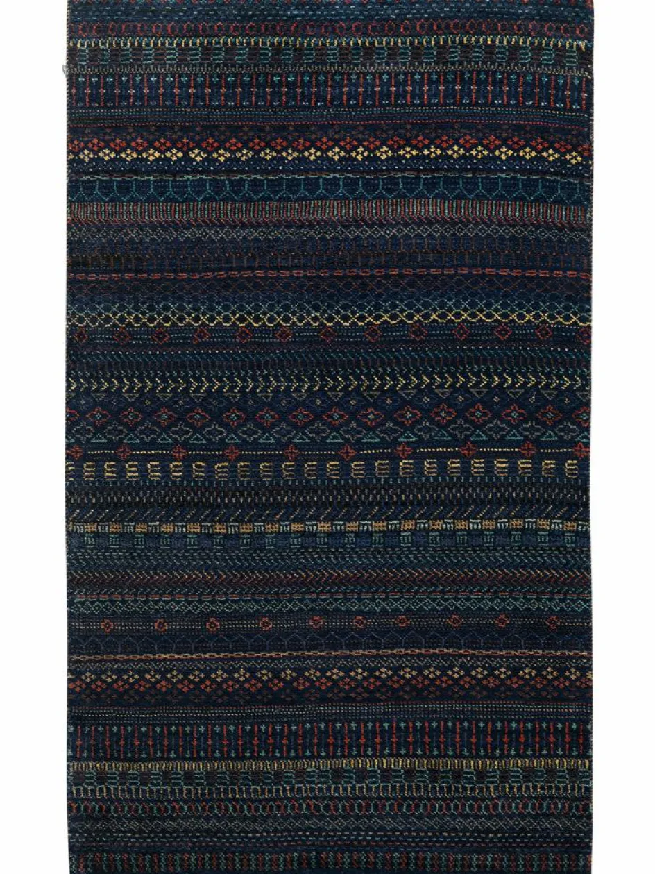 ist eine ungewöhnliche moderne Variation des traditionellen persichen Gabbehs. Er ist kürzer im Flor und feiner geknüpft. Es gibt zahllose Neukreationen in individuellen und einzigartigen Farben und Mustern.| Gesamthöhe: | ca. 10 mm |