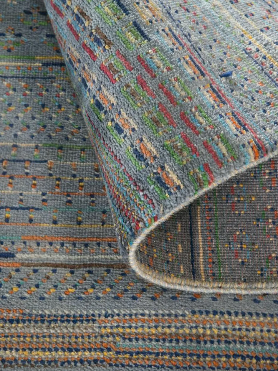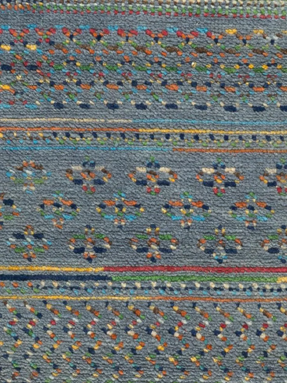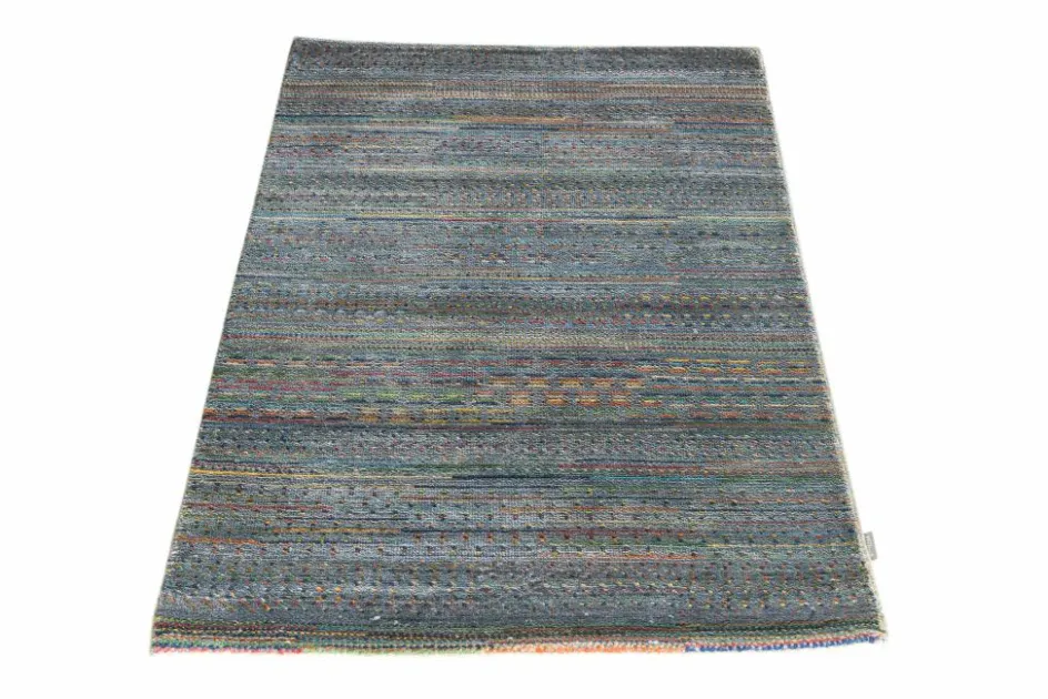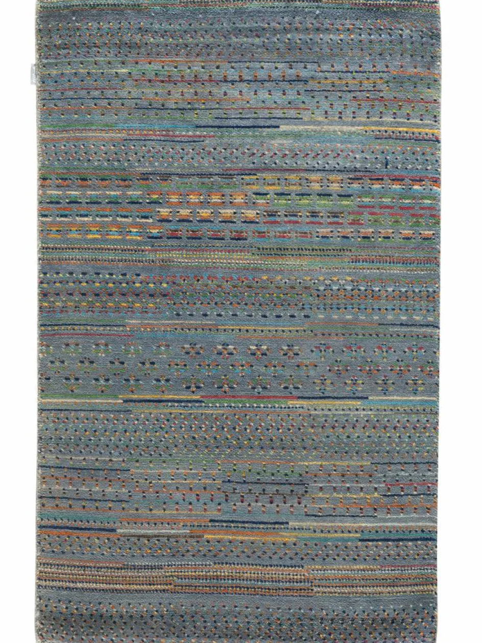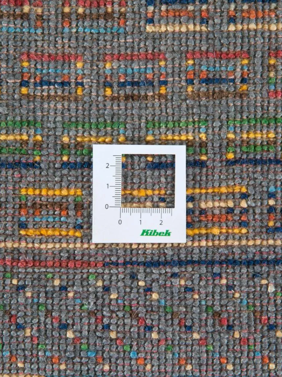 ist eine ungewöhnliche moderne Variation des traditionellen persichen Gabbehs. Er ist kürzer im Flor und feiner geknüpft. Es gibt zahllose Neukreationen in individuellen und einzigartigen Farben und Mustern.| Gesamthöhe: | ca. 10 mm |