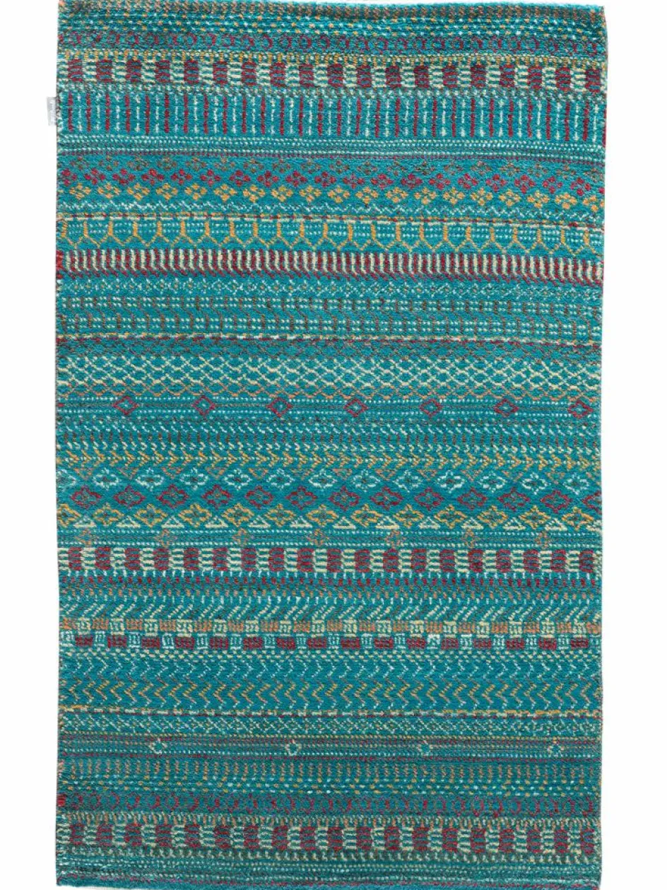 ist eine ungewöhnliche moderne Variation des traditionellen persichen Gabbehs. Er ist kürzer im Flor und feiner geknüpft. Es gibt zahllose Neukreationen in individuellen und einzigartigen Farben und Mustern.| Gesamthöhe: | ca. 10 mm |