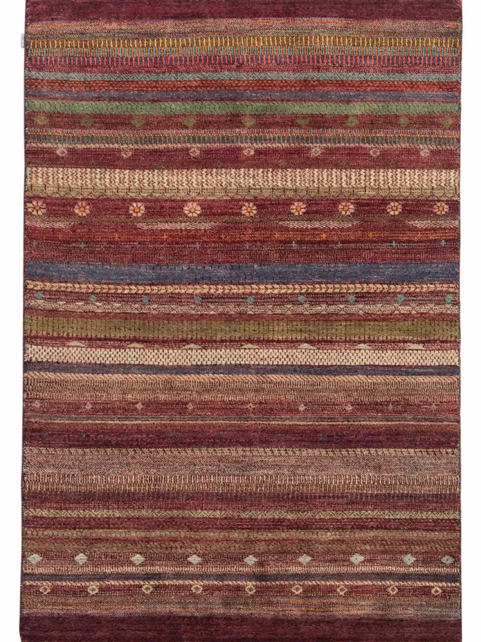 ist eine ungewöhnliche moderne Variation des traditionellen persichen Gabbehs. Er ist kürzer im Flor und feiner geknüpft. Es gibt zahllose Neukreationen in individuellen und einzigartigen Farben und Mustern.| Gesamthöhe: | ca. 7 mm |